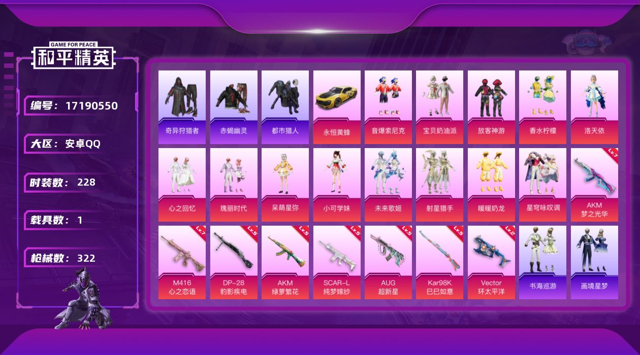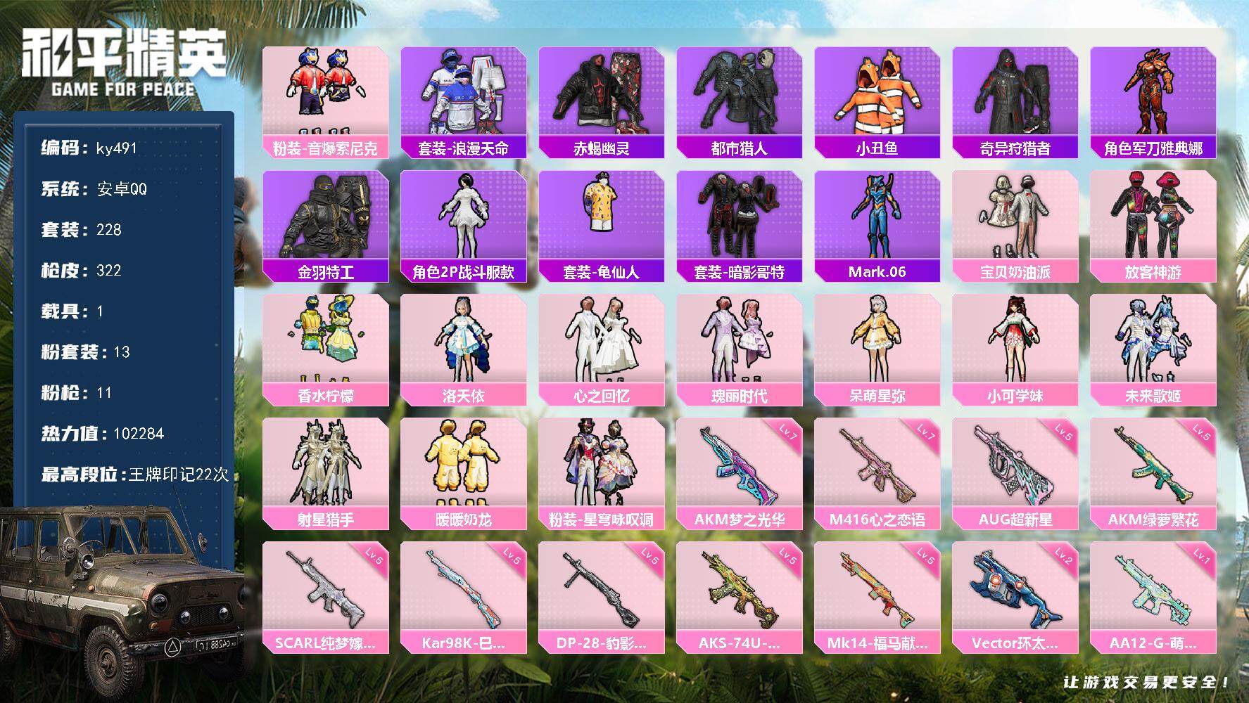 [17190550]安卓 手Q-13粉装-11特效枪-1载具-5粉色飞行器-102284热力值-22王牌印记-228套装-322枪皮