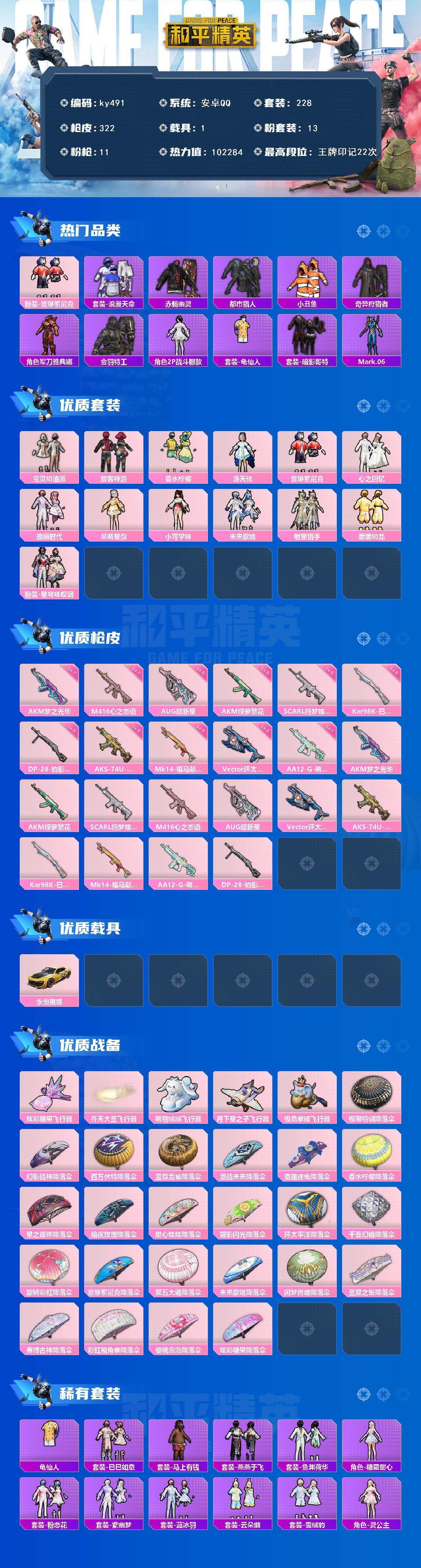 [17190550]安卓 手Q-13粉装-11特效枪-1载具-5粉色飞行器-102284热力值-22王牌印记-228套装-322枪皮 【热门品类】:粉装-音爆索尼克,套装-浪漫天命,套装-赤蝎幽灵,套装-都市猎人,套装-小丑鱼,套装-奇异狩猎者,角色-军刀雅典娜,套装-金羽特工,角色-2P战斗服款,套装-龟仙人,套装-暗影哥特,角色-Mark.06 【粉色套装】:粉装-宝贝奶油派,粉装-放客神游,粉装-香水柠檬,角色-洛天依,粉装-音爆索尼克,粉装-心之回忆,粉装-瑰丽时代,角色-呆萌星弥,角色-小可学妹,粉装-未来歌姬,粉装-射星猎手,粉装-暖暖奶龙,粉装-星穹咏叹调 【粉色枪皮等级】:AKM-梦之光华(七级),AKM-绿萝繁花(五级),SCAR-L-纯梦嫁纱(五级),M416-心之恋语(七级),AUG-超新星(五级),Vector-环太平洋(二级),AKS-74U-森灵之息(五级),Kar98K-巳巳如意(五级),Mk14-福马献瑞(五级),AA12-G-萌骑幻想(一级),DP-28-豹影疾电(五级) 【粉色载具】:永恒黄蜂 【粉色枪皮】:AKM-梦之光华,AKM-绿萝繁花,SCAR-L-纯梦嫁纱,M416-心之恋语,AUG-超新星,Vector-环太平洋,AKS-74U-森灵之息,Kar98K-巳巳如意,Mk14-福马献瑞,AA12-G-萌骑幻想,DP-28-豹影疾电 【粉色飞行器】:炫彩糖果飞行器,齐天大圣飞行器,萌物绒绒飞行器,月下星之子飞行器,极意拳锋飞行器 【粉色降落伞】:极限特训降落伞,幻影战神降落伞,百万伏特降落伞,至尊龙雀降落伞,激战未来降落伞,童趣迷兔降落伞,香水柠檬降落伞,星之彼岸降落伞,暗夜玫瑰降落伞,甜心娃娃降落伞,碧影闪光降落伞,环太平洋降落伞,千面幻镜降落伞,旋转彩虹降落伞,音爆索尼克降落伞,第五大道降落伞,未来歌姬降落伞,闲梦青缨降落伞,圣堂之誓降落伞,赛博古神降落伞,彩虹独角兽降落伞,樱桃泡泡降落伞,炫彩糖果降落伞 【稀有套装】:套装-龟仙人,套装-巳巳如意,套装-雪国风尚,套装-炫彩糖果,套装-马上有钱,套装-燕燕于飞,套装-鱼渊荷华,角色-糖霜甜心,套装-粉恋花,套装-紫幽梦,套装-蓝冰羽,套装-云朵鹅,套装-雪绒豹,角色-灵公主,套装-朱霞炽焰,套装-凌霄紫焰,套装-书海巡游,套装-画境星梦,套装-琴音绮想,套装-雨过天青,套装-红釉青花 【