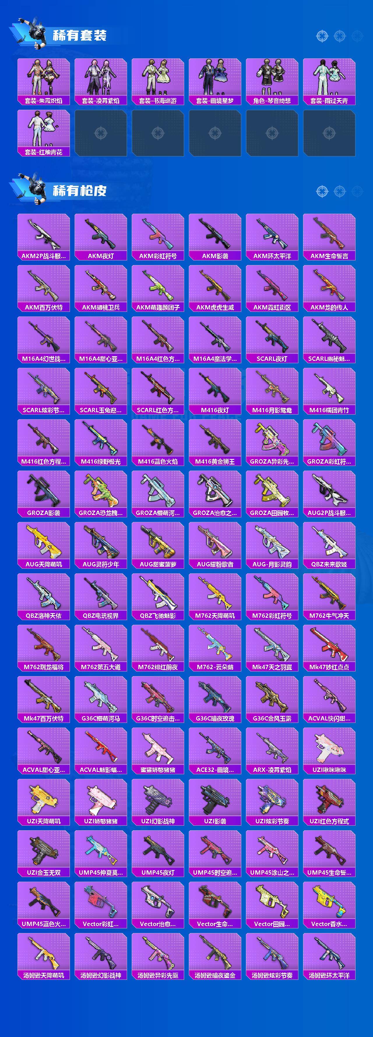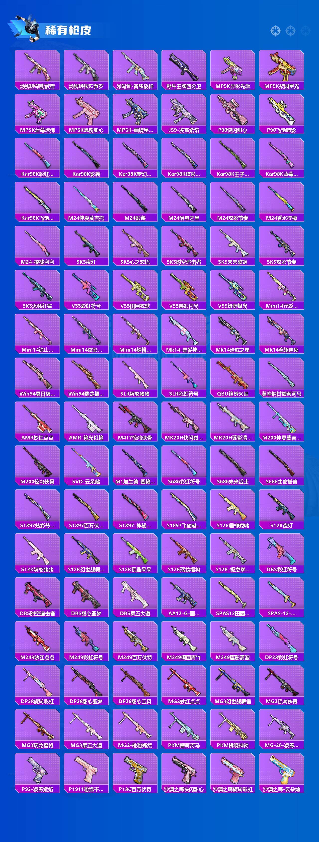 【粉色枪皮】:AKM-梦之光华,AKM-绿萝繁花,SCAR-L-纯梦嫁纱,M416-心之恋语,AUG-超新星,Vector-环太平洋,AKS-74U-森灵之息,Kar98K-巳巳如意,Mk14-福马献瑞,AA12-G-萌骑幻想,DP-28-豹影疾电