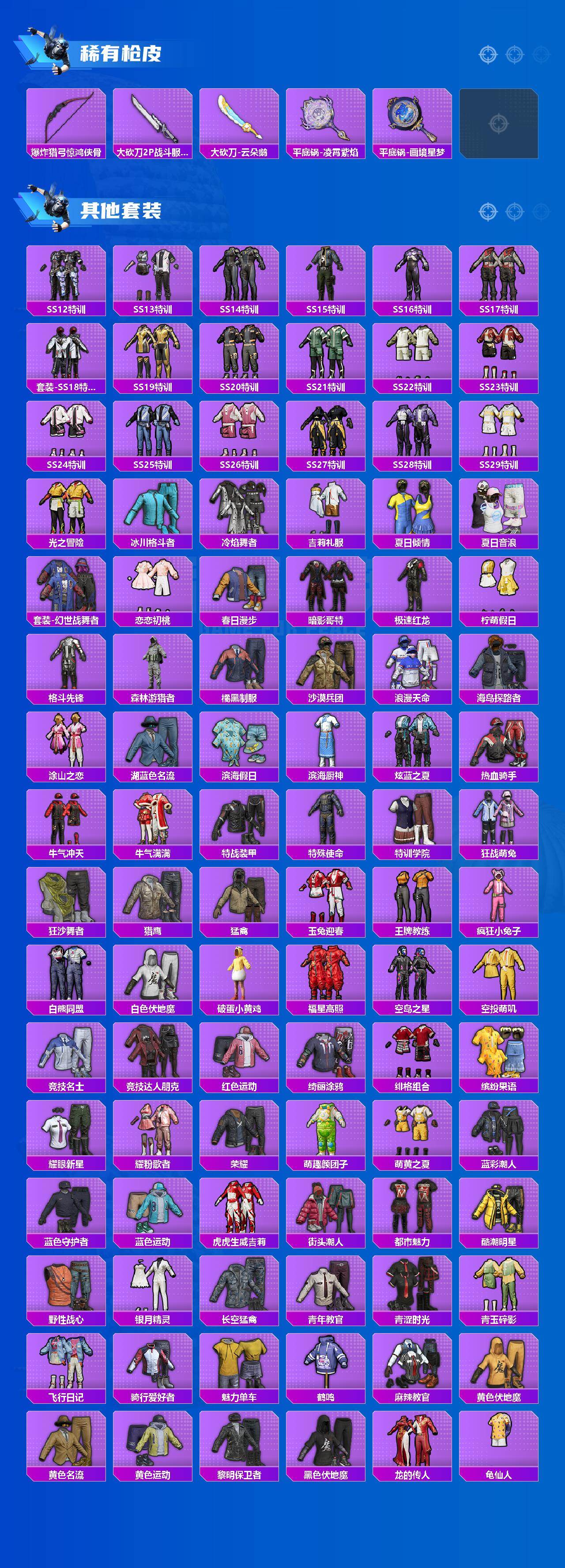 【稀有套装】:套装-龟仙人,套装-巳巳如意,套装-雪国风尚,套装-炫彩糖果,套装-马上有钱,套装-燕燕于飞,套装-鱼渊荷华,角色-糖霜甜心,套装-粉恋花,套装-紫幽梦,套装-蓝冰羽,套装-云朵鹅,套装-雪绒豹,角色-灵公主,套装-朱霞炽焰,套装-凌霄紫焰,套装-书海巡游,套装-画境星梦,套装-琴音绮想,套装-雨过天青,套装-红釉青花
