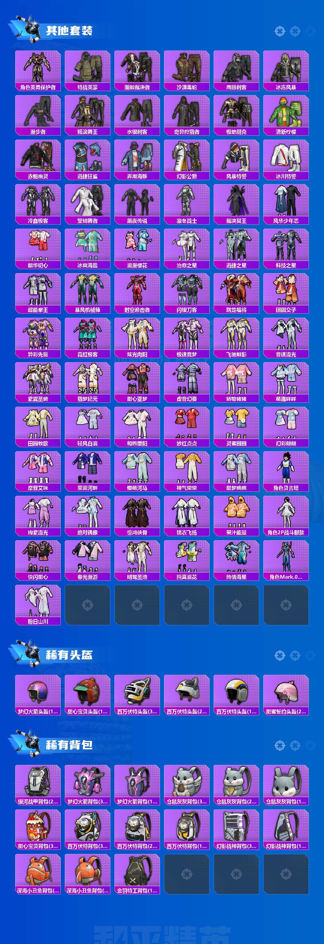 【热门品类】:粉装-音爆索尼克,套装-浪漫天命,套装-赤蝎幽灵,套装-都市猎人,套装-小丑鱼,套装-奇异狩猎者,角色-军刀雅典娜,套装-金羽特工,角色-2P战斗服款,套装-龟仙人,套装-暗影哥特,角色-Mark.06