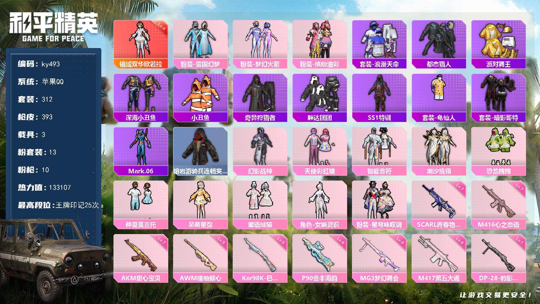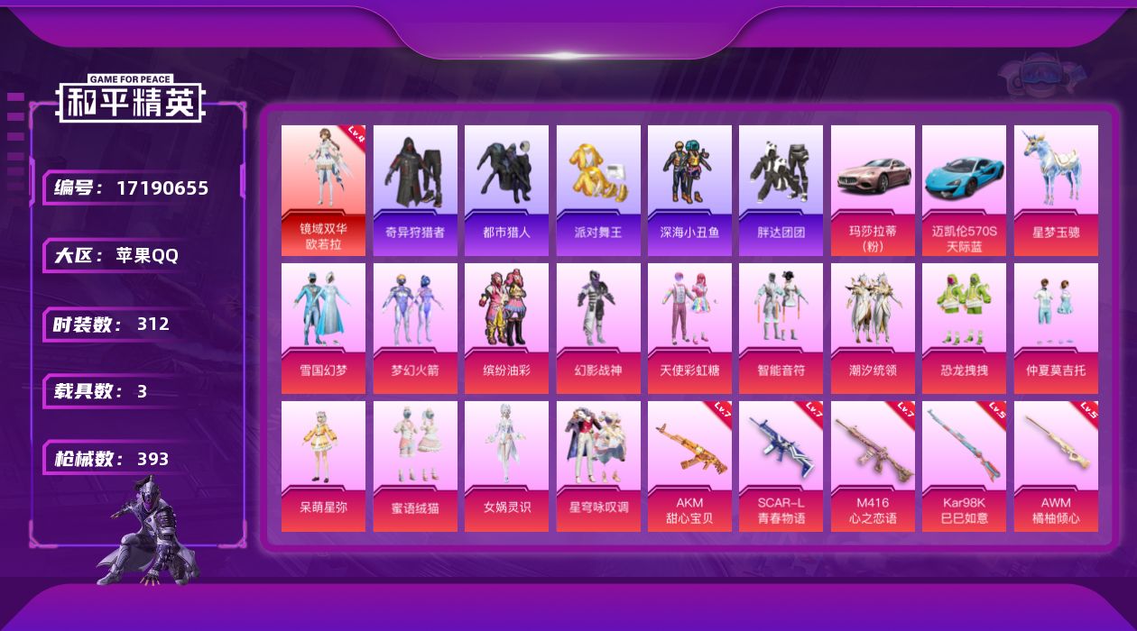 [17190655]苹果 手Q-1神装-13粉装-10特效枪-3载具-5粉色飞行器-133107热力值-25王牌印记-312套装-393枪皮