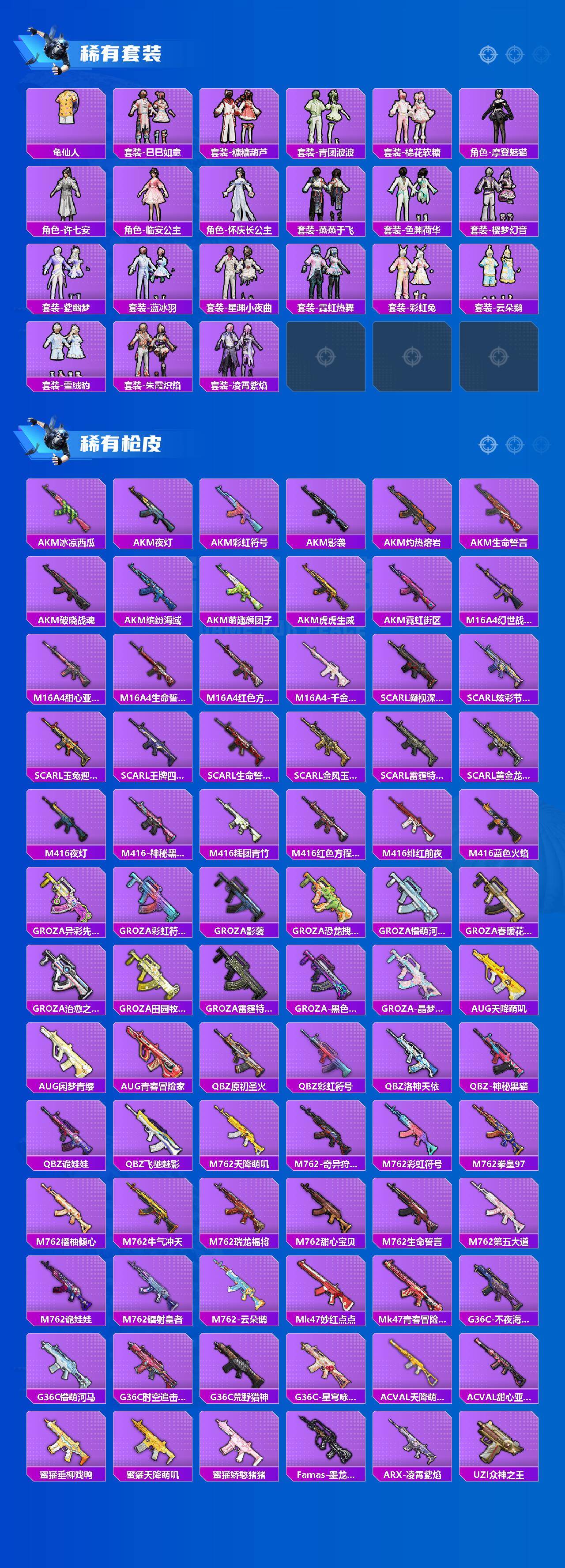 AKM-甜心宝贝,SCAR-L-青春物语,M416-心之恋语,P90-金丰海韵,Kar98K-巳巳如意,AWM-橘柚倾心,M417-第五大道,MG3-梦幻舞会
