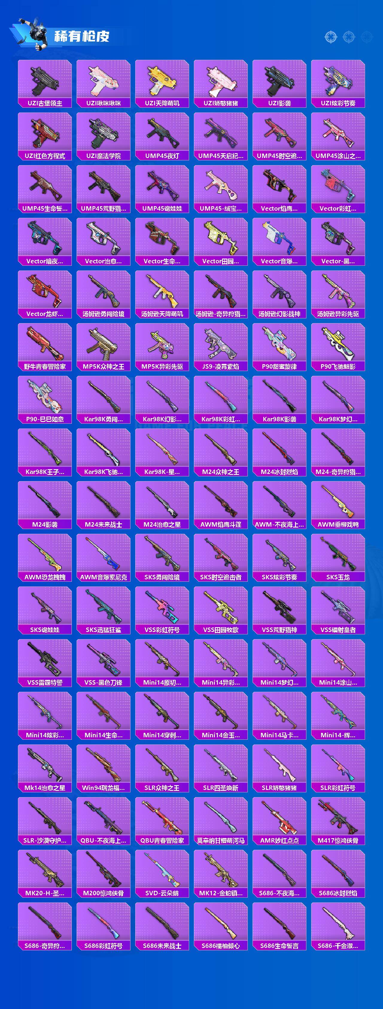 【粉色枪皮】:AKM-甜心宝贝,SCAR-L-青春物语,M416-心之恋语,P90-金丰海韵,Kar98K-巳巳如意,AWM-橘柚倾心,M417-第五大道,DP-28-豹影疾电,MG3-梦幻舞会,MG-36-沧焰双生
