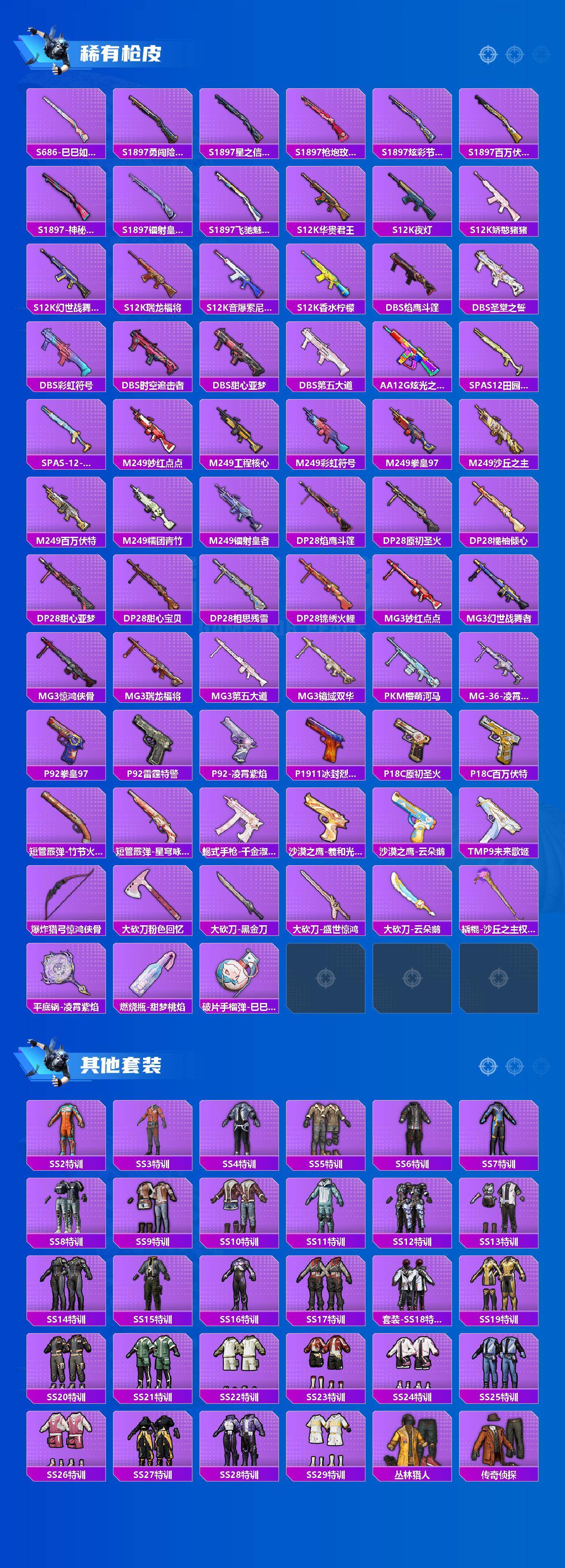 AKM-缤纷海域,M762-奇异狩猎者,M762-瑞龙福将,M24-奇异狩猎者,S686-奇异狩猎者