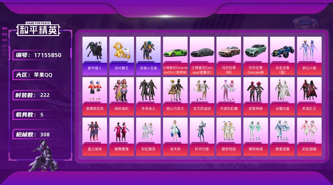 [17155850]苹果 手Q-24粉装-19特效枪-5载具-8粉色飞行器-113615热力值-20王牌印记-222套装-308枪皮