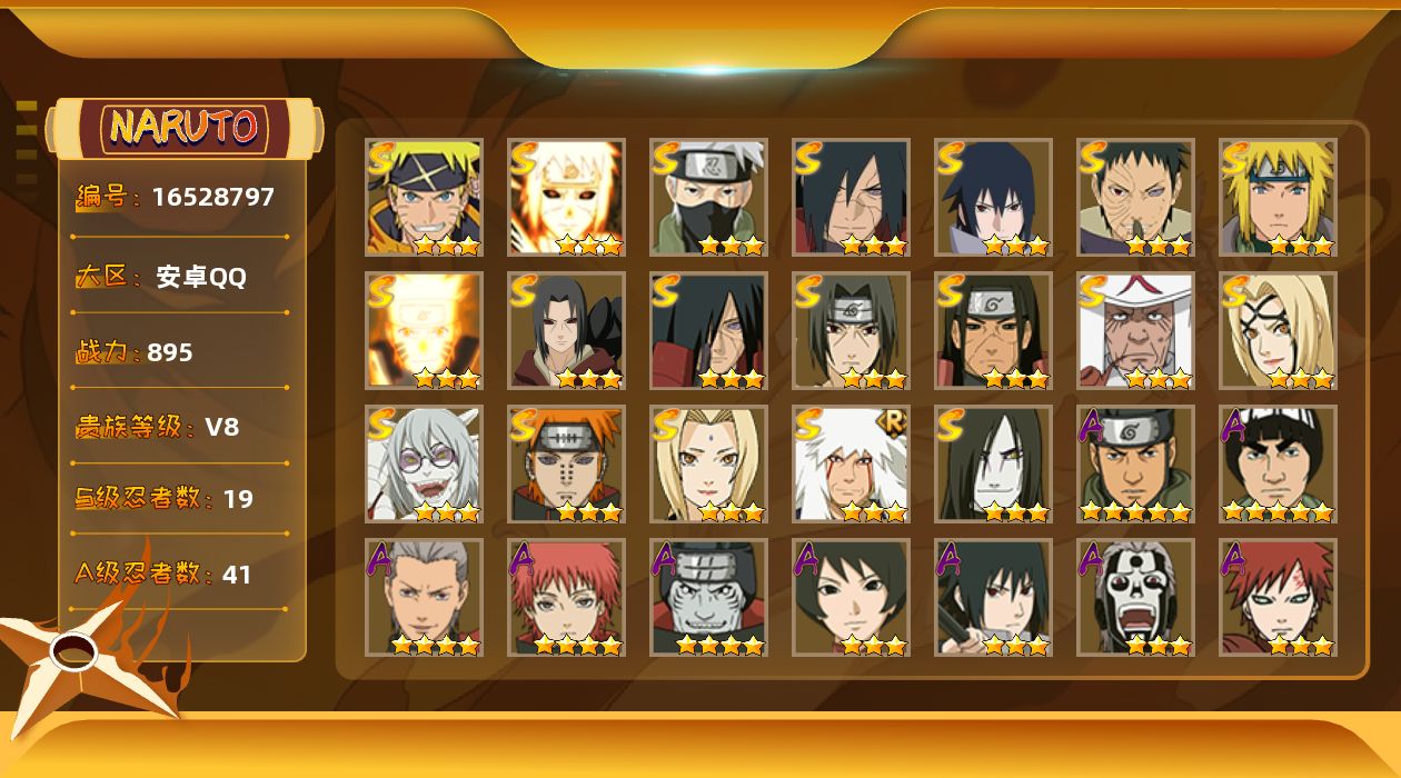 【S级忍者】:千手柱间「秽土转生」(3星),宇智波鼬「秽土转生」(3星),宇智波斑「秽土转生」(3星),宇智波斑「秽土转生·解」(3星),宇智波带土「忍界大战」(3星),宇智波鼬「须佐能乎」(3星),旗木卡卡西「须佐能乎」(3星),自来也「舞之豪杰」(3星),大蛇丸(3星),纲手(3星),纲手「百豪」(3星),猿飞日斩(3星),波风水门(3星),药师兜「仙人模式」(3星),漩涡鸣人「九喇嘛连结」(3星),佩恩「天道」(3星),宇智波佐助「永恒万花筒」(3星),波风水门「九喇嘛连结」(3星),漩涡鸣人·宇智波佐助(3星)