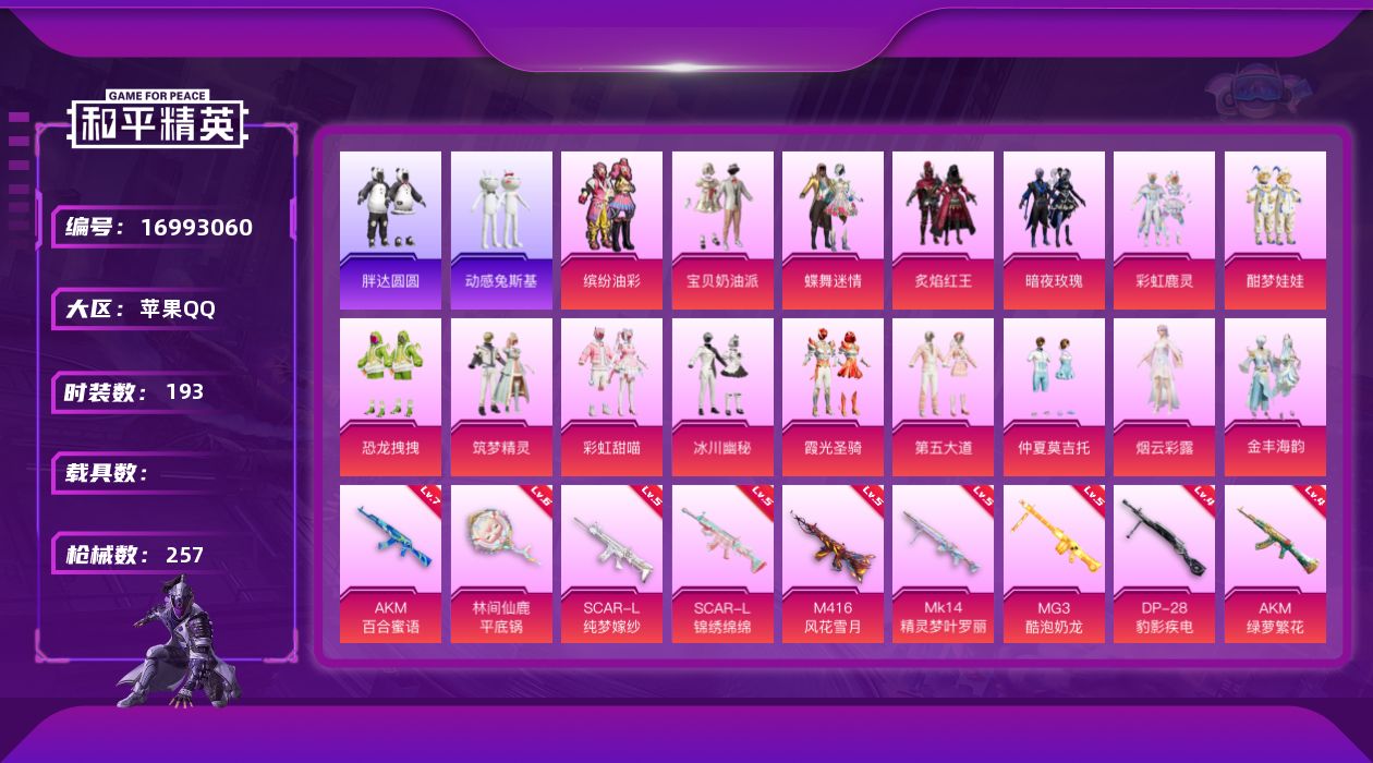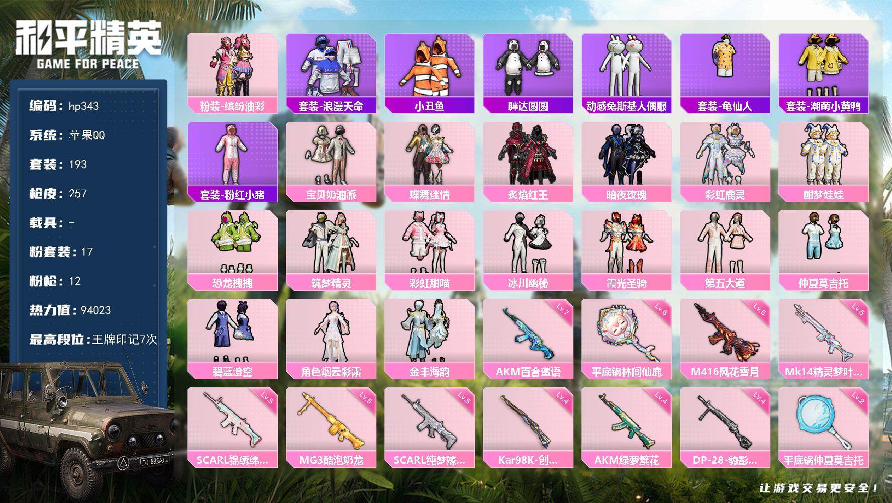 [16993060]苹果 手Q-17粉装-12特效枪-0载具-3粉色飞行器-94023热力值-7王牌印记-193套装-257枪皮