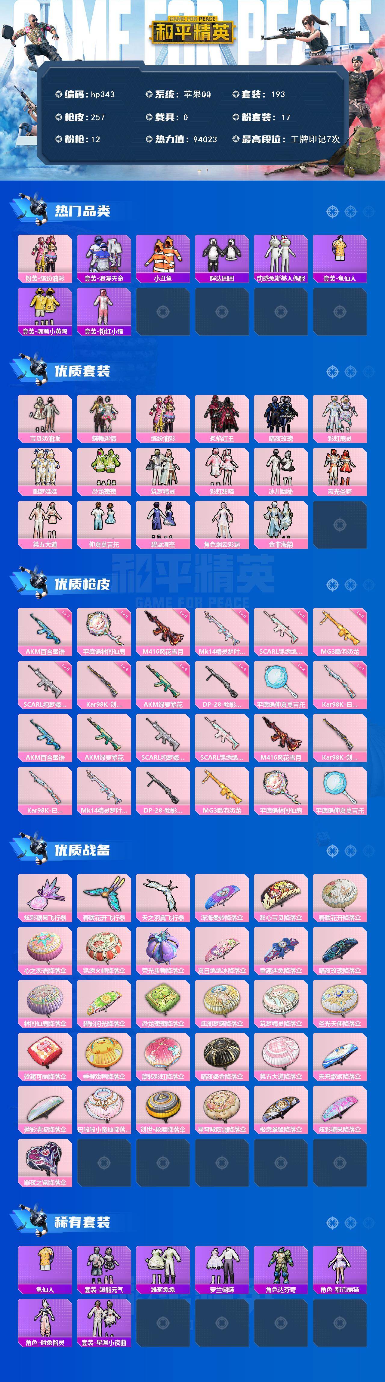 [16993060]苹果 手Q-17粉装-12特效枪-0载具-3粉色飞行器-94023热力值-7王牌印记-193套装-257枪皮 【热门品类】:粉装-缤纷油彩,套装-浪漫天命,套装-小丑鱼,套装-胖达圆圆,套装-动感兔斯基人偶服,套装-龟仙人,套装-潮萌小黄鸭,套装-粉红小猪 【粉色套装】:粉装-宝贝奶油派,粉装-蝶舞迷情,粉装-缤纷油彩,粉装-炙焰红王,粉装-暗夜玫瑰,粉装-彩虹鹿灵,粉装-酣梦娃娃,粉装-恐龙拽拽,粉装-筑梦精灵,粉装-彩虹甜喵,粉装-冰川幽秘,粉装-霞光圣骑,粉装-第五大道,粉装-仲夏莫吉托,粉装-碧蓝澄空,角色-烟云彩露,粉装-金丰海韵 【粉色枪皮等级】:AKM-百合蜜语(七级),AKM-绿萝繁花(四级),SCAR-L-纯梦嫁纱(五级),SCAR-L-锦绣绵绵(五级),M416-风花雪月(五级),Kar98K-创世·救赎(四级),Kar98K-巳巳如意(一级),Mk14-精灵梦叶罗丽(五级),DP-28-豹影疾电(四级),MG3-酷泡奶龙(五级),平底锅-林间仙鹿(六级),平底锅-仲夏莫吉托(二级) 【粉色枪皮】:AKM-百合蜜语,AKM-绿萝繁花,SCAR-L-纯梦嫁纱,SCAR-L-锦绣绵绵,M416-风花雪月,Kar98K-创世·救赎,Kar98K-巳巳如意,Mk14-精灵梦叶罗丽,DP-28-豹影疾电,MG3-酷泡奶龙,平底锅-林间仙鹿,平底锅-仲夏莫吉托 【粉色飞行器】:炫彩糖果飞行器,春暖花开飞行器,天之羽翼飞行器 【粉色降落伞】:深海曼妙降落伞,甜心宝贝降落伞,春暖花开降落伞,心之恋语降落伞,锦绣火鲤降落伞,荧光虫舞降落伞,夏日绵绵冰降落伞,童趣迷兔降落伞,暗夜玫瑰降落伞,林间仙鹿降落伞,碧影闪光降落伞,恐龙拽拽降落伞,庄周梦蝶降落伞,筑梦精灵降落伞,圣光天使降落伞,妙趣可丽降落伞,垂柳戏鸭降落伞,旋转彩虹降落伞,暗夜鎏金降落伞,第五大道降落伞,未来歌姬降落伞,莲影清波降落伞,巴啦啦小魔仙降落伞,创世·救赎降落伞,星穹咏叹调降落伞,极意拳锋降落伞,炫彩糖果降落伞,罪夜之冕降落伞 【稀有套装】:套装-龟仙人,套装-超能元气,套装-炫彩糖果,套装-雏菊兔兔,套装-萝兰蝴蝶,角色-达芬奇,角色-都市丽猫,角色-俏兔智灵,套装-星渊小夜曲 【稀有枪皮】:AKM-夜灯,AKM-彩虹符号,AKM-春暖花开,AKM-灼热熔岩,AKM-王牌投手,AKM-筑梦精灵