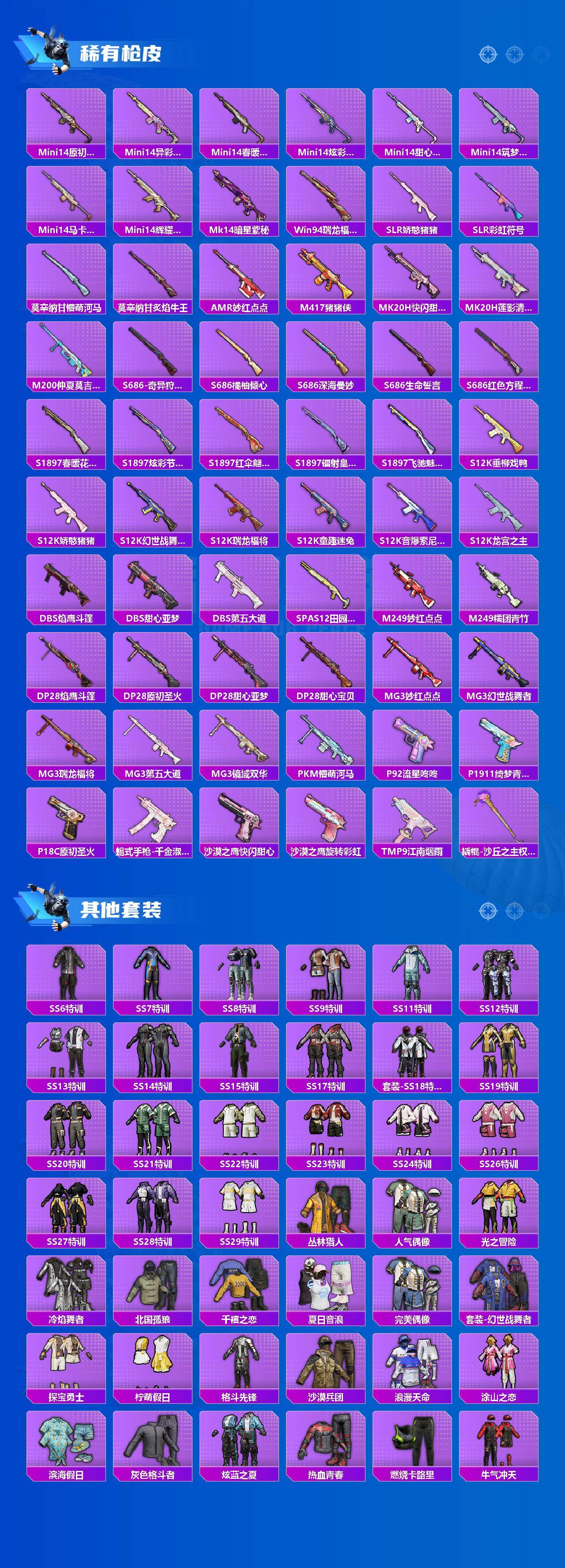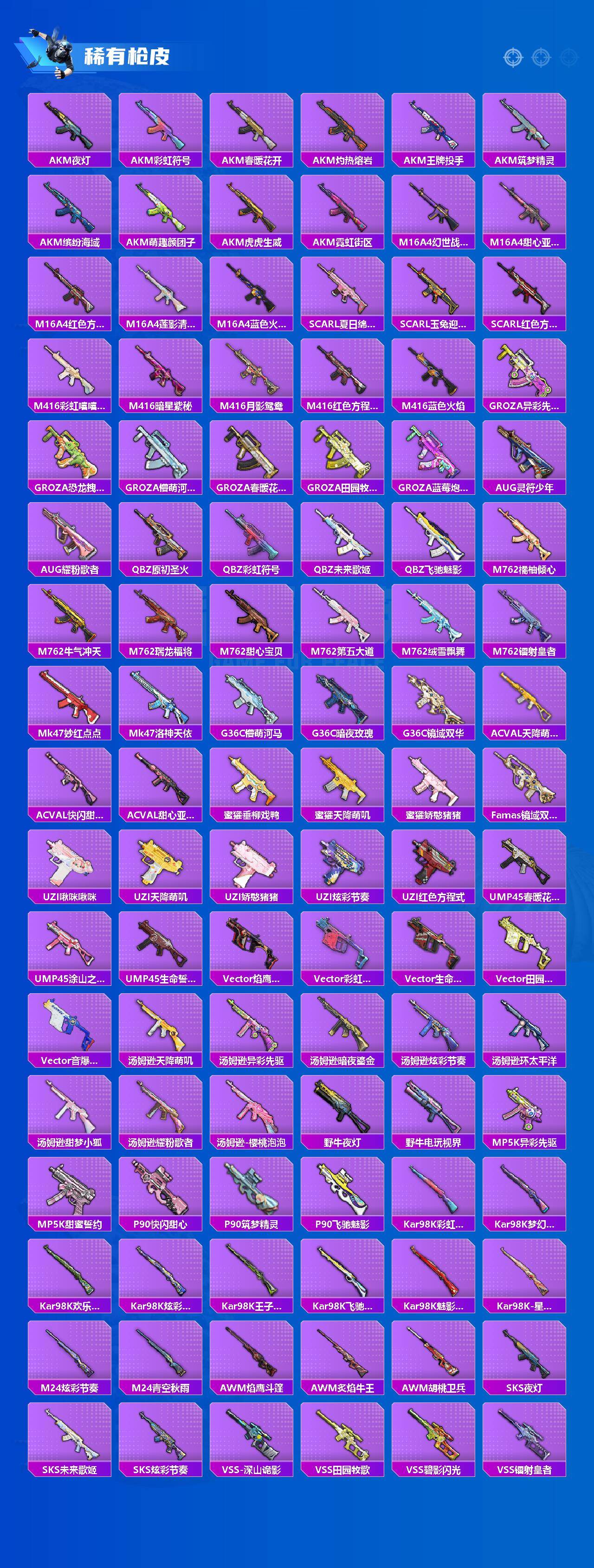 【粉色枪皮】:AKM-百合蜜语,AKM-绿萝繁花,SCAR-L-纯梦嫁纱,SCAR-L-锦绣绵绵,M416-风花雪月,Kar98K-创世·救赎,Kar98K-巳巳如意,Mk14-精灵梦叶罗丽,DP-28-豹影疾电,MG3-酷泡奶龙,平底锅-林间仙鹿,平底锅-仲夏莫吉托