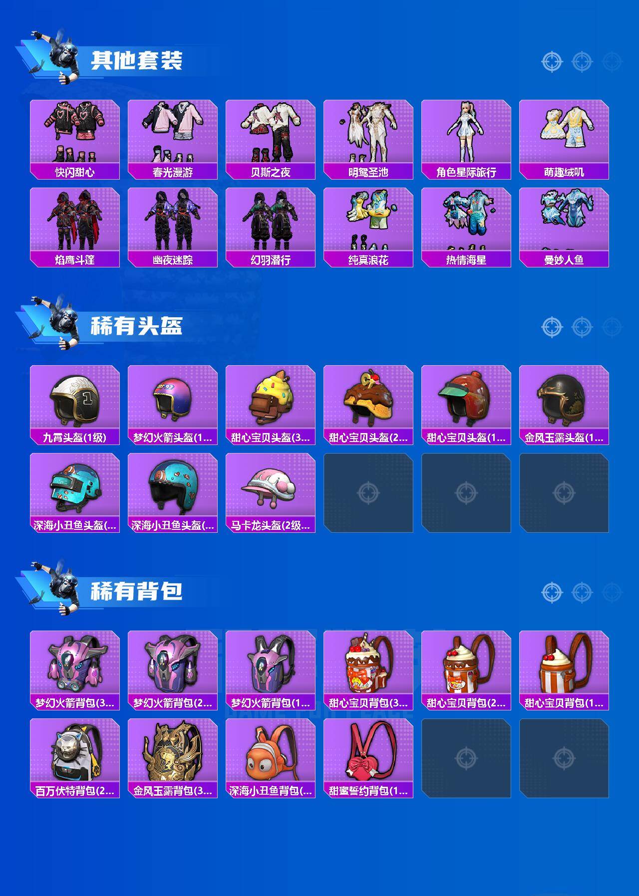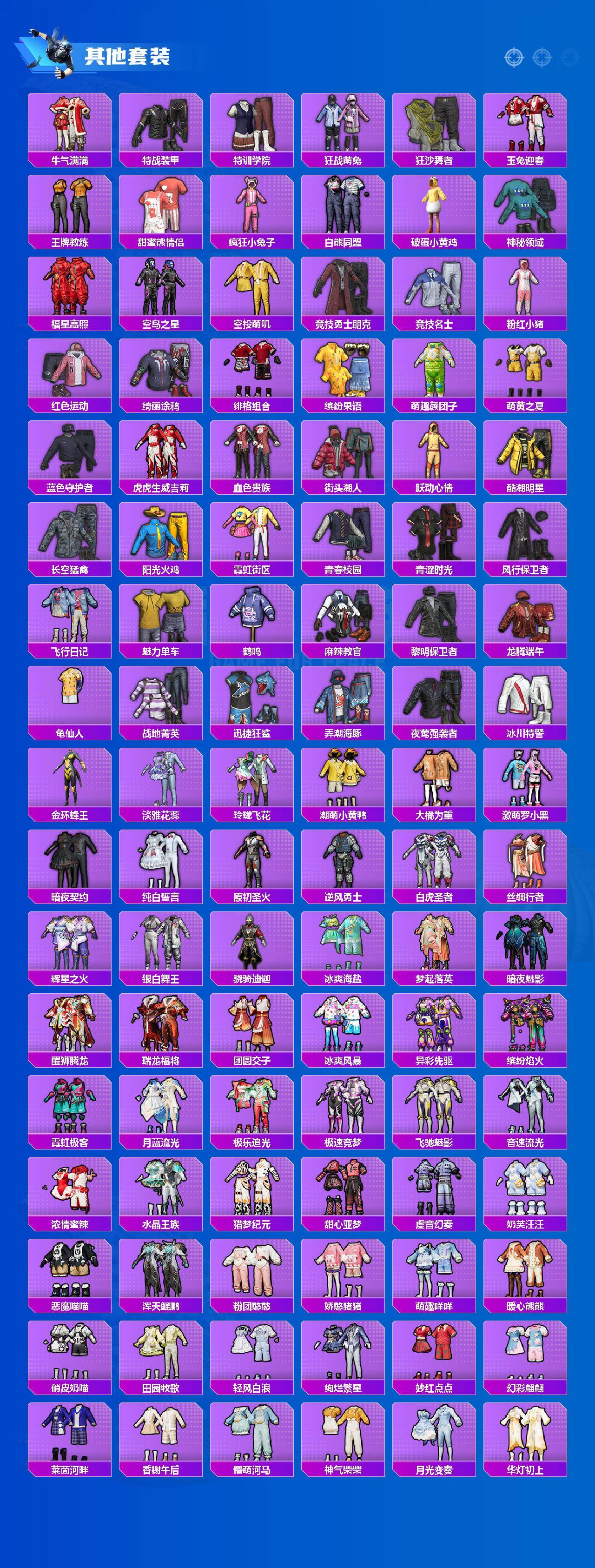 套装-缤纷油彩,套装-胖达圆圆,套装-潮萌小黄鸭,套装-宝贝奶油派,套装-蝶舞迷情,套装-炙焰红王,套装-暗夜玫瑰,套装-彩虹鹿灵,套装-酣梦娃娃,恐龙拽拽套装,套装-筑梦精灵,套装-彩虹甜喵,套装-冰川幽秘,套装-霞光圣骑,套装-第五大道,套装-仲夏莫吉托,套装-碧蓝澄空,角色-烟云彩露,套装-金丰海韵,套装-迅捷狂鲨,套装-大橘为重,套装-奶芙汪汪,套装-恶魔喵喵