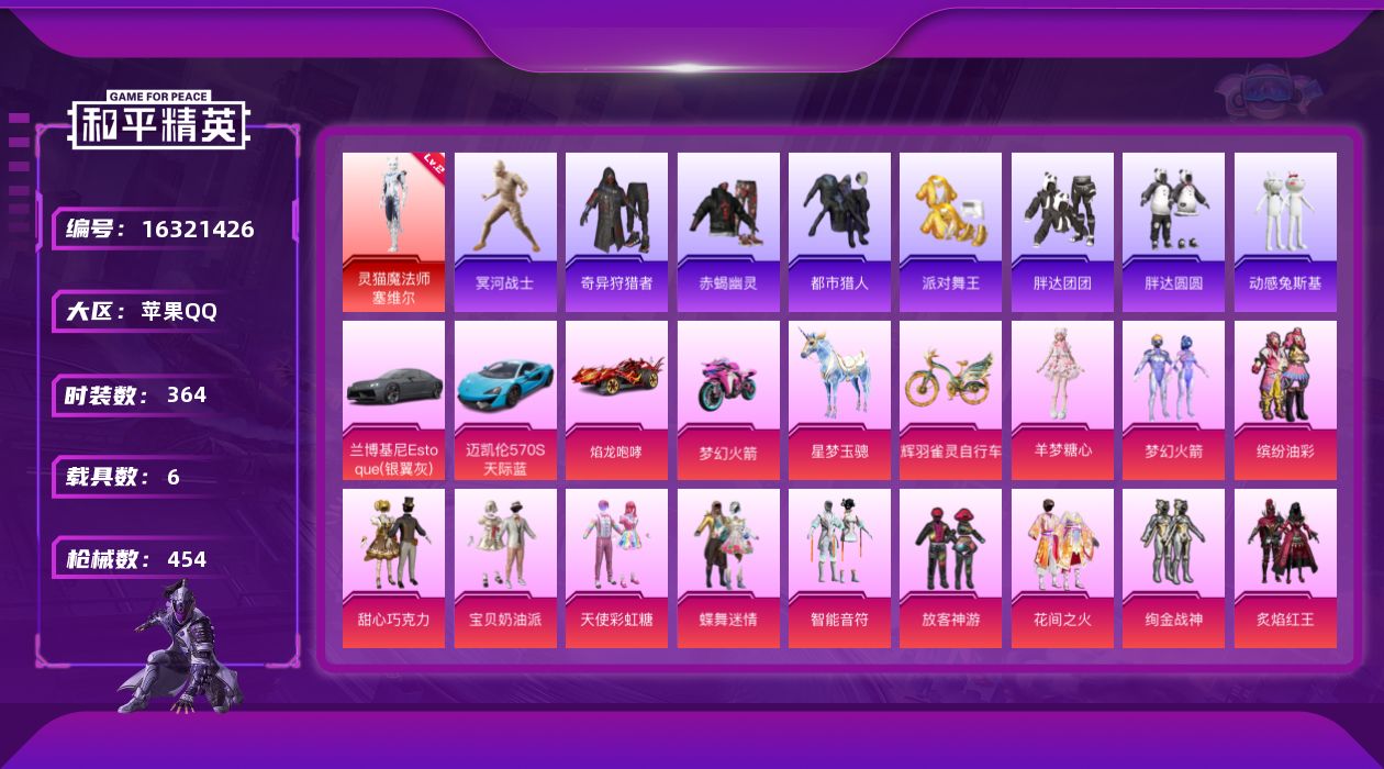 [16321426]苹果 手Q-1神装-54粉装-35特效枪-6载具-14粉色飞行器-182141热力值-15王牌印记-364套装-454枪皮