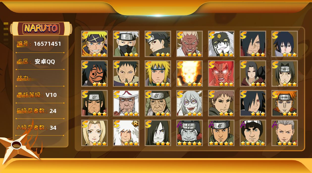 [16571451]24S级忍者数-34A级忍者数 【S级忍者】:猿飞日斩「秽土转生」(3星),千手柱间「秽土转生」(3星),宇智波鼬「秽土转生」(3星),宇智波斑「秽土转生·解」(3星),宇智波带土「忍界大战」(3星),艾「忍界大战」(3星),宇智波鼬「须佐能乎」(3星),宇智波止水「须佐能乎」(3星),旗木卡卡西「须佐能乎」(3星),宇智波斑「木叶创立」(3星),罗砂「四代目风影」(3星),自来也「舞之豪杰」(3星),大蛇丸(3星),纲手(3星),猿飞日斩(3星),波风水门(3星),药师兜「仙人模式」(3星),神秘面具男「红夜之刃」(3星),漩涡鸣人「九喇嘛连结」(3星),迈特凯「死门」(3星),佩恩「天道」(3星),宇智波佐助「永恒万花筒」(3星),大筒木桃式(3星),漩涡鸣人·宇智波佐助(3星) 【A级忍者】:艾「青年」(2星),长门「青年」(2星),波风水门「青年」(2星),达鲁伊「博人传」(3星),奇拉比「忍界大战」(2星),飞段(4星),飞段「死司凭血」(2星),干柿鬼鲛(5星),漩涡博人「桃式显现」(2星),迈特凯(5星),桃地再不斩「秽土转生」(2星),我爱罗「疾风传」(4星),蝎(4星),蝎「绯流琥」(2星),猿飞阿斯玛(5星),宇智波鼬(2星),宇智波佐助「须佐能乎」(2星),宇智波佐助「万花筒写轮眼」(2星),照美冥「五代目水影」(2星),日向宁次「忍界大战」(2星),宇智波带土「漂泊浪客」(2星),长十郎「六代目水影」(2星),神秘面具男「忍者之路」(2星),李洛克「忍界大战」(2星),猿飞木叶丸「博人传」(2星),黑土「博人传」(2星),秋道丁次「忍界大战」(2星),千代「近松十人卫」(2星),不缘(2星),宇智波泉奈(2星),不动(2星),大野木「侠隐江湖」(2星),巳月「仙人模式」(2星),迈特凯「青春爆炸」(2星)