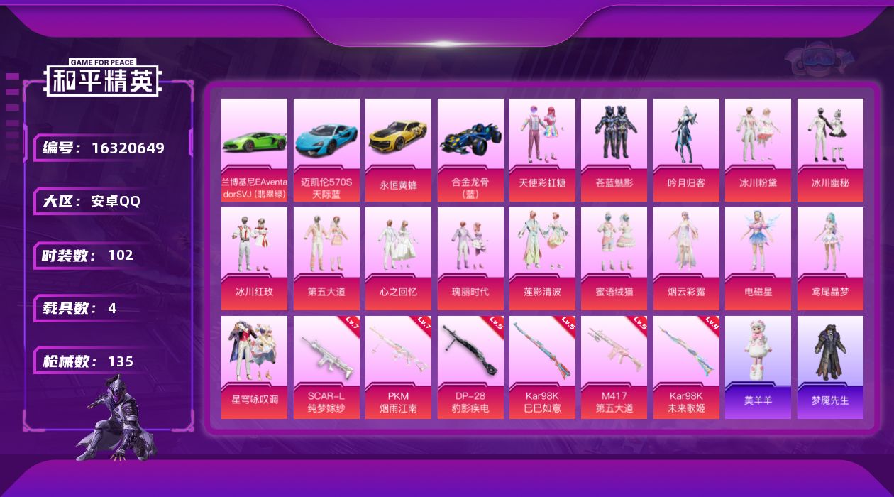 [16320649]安卓 手Q-15粉装-6特效枪-4载具-3粉色飞行器-52767热力值-3王牌印记-102套装-135枪皮