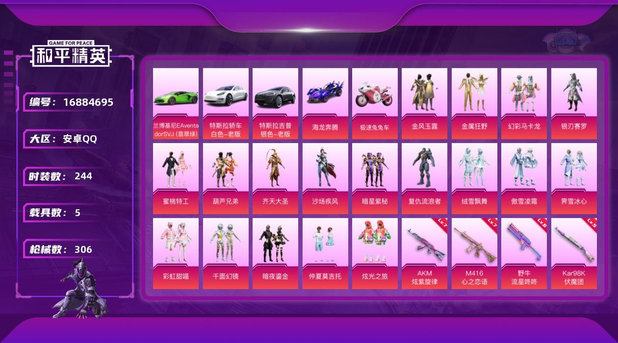 [16884695]【968】安卓 手Q-18粉装-4特效枪-5载具-5粉色飞行器-132106热力值-12王牌印记-244套装-306枪皮 【热门品类】:角色-军刀雅典娜,套装-SS1特训,套装-龟仙人,套装-潮萌小黄鸭,套装-浪漫波比,套装-粉红小猪,小恶魔头饰,熔岩游骑兵面罩 【粉色载具】:特斯拉Model 3(珍珠白),特斯拉Model X(冷光银),兰博基尼Aventador SVJ(翡翠绿),海龙奔腾,极速兔兔车 【粉色套装】:粉装-金风玉露,粉装-金属狂野,粉装-幻彩马卡龙,粉装-银刃赛罗,粉装-蜜桃特工,粉装-葫芦兄弟,粉装-齐天大圣,粉装-沙场疾风,粉装-暗星紫秘,角色-复仇流浪者,粉装-绒雪飘舞,粉装-傲雪凌霜,粉装-霁雪冰心,粉装-彩虹甜喵,粉装-千面幻镜,粉装-暗夜鎏金,粉装-仲夏莫吉托,粉装-炫光之旅 【粉色枪皮等级】:AKM-炫紫旋律(七级),M416-心之恋语(七级),野牛-流星咚咚(六级),Kar98K-伏魔团(五级) 【粉色枪皮】:AKM-炫紫旋律,M416-心之恋语,野牛-流星咚咚,Kar98K-伏魔团 【粉色飞行器】:梦幻火箭飞行器,炫紫旋律飞行器,古堡领主飞行器,锦绣火鲤飞行器,庄周梦蝶飞行器 【粉色降落伞】:华贵君王降落伞,天启纪元降落伞,炫紫旋律降落伞,神秘黑猫降落伞,古堡领主降落伞,四圣焕新降落伞,扶摇飞仙降落伞,花间之火降落伞,锦绣火鲤降落伞,夏日绵绵冰降落伞,香水柠檬降落伞,王牌四分卫降落伞,烈焰拳霸降落伞,暗夜玫瑰降落伞,洛神天依降落伞,蓝莓炮弹降落伞,筑梦精灵降落伞,妙趣可丽降落伞,荒漠赏金降落伞,绒雪飘舞降落伞,垂柳戏鸭降落伞,彩虹甜喵降落伞,青空秋雨降落伞,第五大道降落伞,仲夏莫吉托降落伞,飒粉甜心降落伞 【稀有套装】:套装-龟仙人 【稀有枪皮】:AKM-墨染幽兰,AKM-夜灯,AKM-天启纪元,AKM-彩虹符号,AKM-星之信仰,AKM-海渊国主,AKM-灼热熔岩,AKM-玉龙,AKM-王牌投手,AKM-环太平洋,AKM-生命誓言,AKM-破晓战魂,AKM-萌趣颜团子,AKM-虎虎生威,AKM-锦绣火鲤,AKM-霓虹街区,AKM-龙的传人,M16A4-夜灯,M16A4-幻世战舞者,M16A4-机械英豪,M16A4-甜心亚梦,M16A4-生命誓言,M16A4-红色方程式,M16A4-蓝色火焰,SCAR-L-流星咚咚,SCAR-