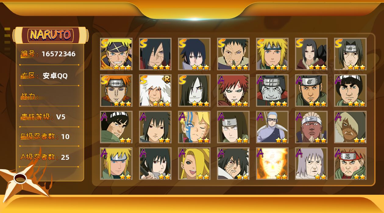 [16572346]10S级忍者数-25A级忍者数 【S级忍者】:宇智波鼬「秽土转生」(3星),宇智波斑「秽土转生·解」(3星),宇智波带土「忍界大战」(3星),宇智波鼬「须佐能乎」(3星),自来也「舞之豪杰」(3星),大蛇丸(3星),波风水门(3星),佩恩「天道」(3星),宇智波佐助「永恒万花筒」(3星),漩涡鸣人·宇智波佐助(3星) 【A级忍者】:艾「青年」(2星),波风水门「青年」(2星),达鲁伊「博人传」(2星),迪达拉「秽土转生」(2星),大蛇丸「晓」(2星),奇拉比(2星),飞段(2星),飞段「死司凭血」(2星),干柿鬼鲛(3星),漩涡博人「桃式显现」(2星),漩涡鸣人「仙人模式」(2星),漩涡鸣人「九尾查克拉」(2星),迈特凯(3星),我爱罗「疾风传」(3星),蝎(2星),猿飞阿斯玛(3星),宇智波佐助「须佐能乎」(2星),宇智波佐助「万花筒写轮眼」(2星),日向宁次「忍界大战」(2星),宇智波带土「暴怒」(2星),长十郎「六代目水影」(2星),秋道丁次「忍界大战」(2星),千代「近松十人卫」(2星),宇智波泉奈(2星),迈特凯「青春爆炸」(2星)