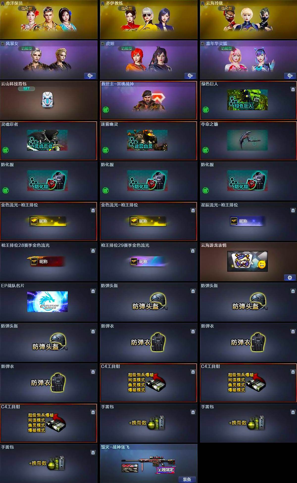 【道具】:云山科技背包,救世主-黑桃战神,绿色巨人,灵魂忍者,迷雾幽灵,夺命之镰,防化服*3,金色流光-枪王排位*2,星辰流光-枪王排位,枪王排位28赛季金色流光,枪王排位29赛季金色流光,云海游龙表情,EP战队名片,防弹头盔*3,防弹衣*3,C4工具钳*3,手雷包*3