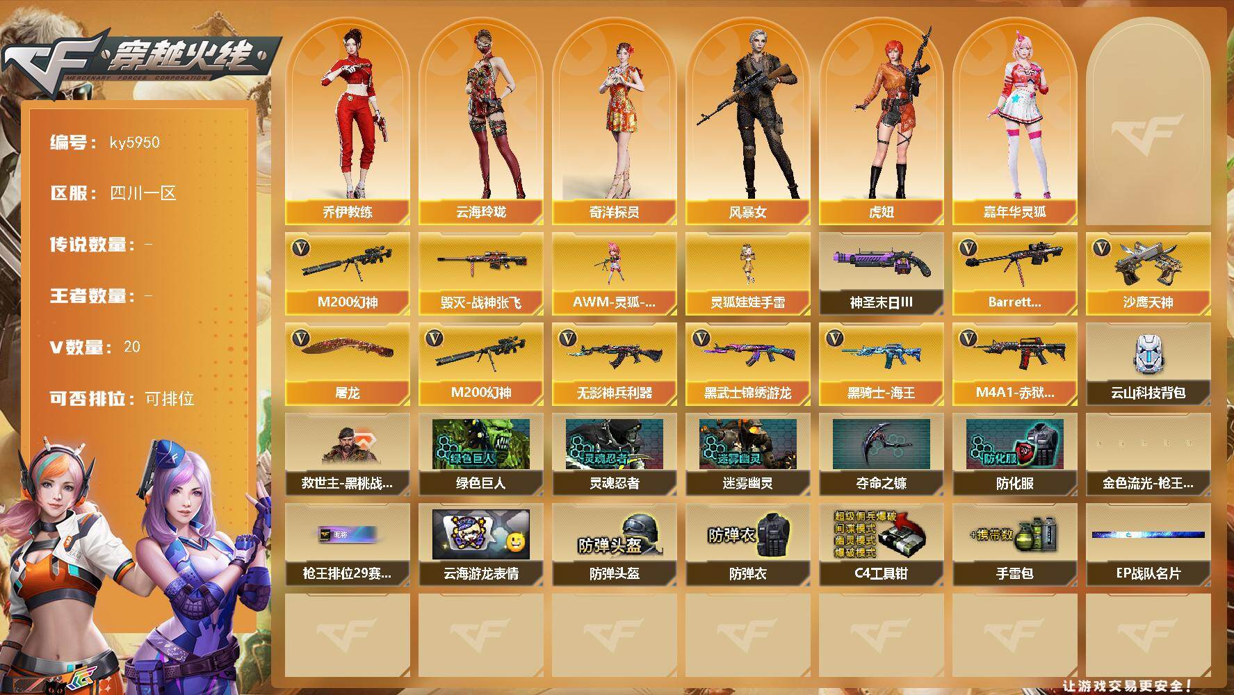 [17108037]四川一区-20V-0王者武器数-0炫金武器数 【热门武器】:M200-幻神 【皮肤】:毁灭-战神张飞 【角色】:奇洋探员,乔伊教练,云海玲珑,风暴女,虎妞,嘉年华灵狐 【人偶武器】:AWM-灵狐-15周年嘉年华,灵狐娃娃手雷 【挑战大师】:神圣爆裂者-末日III 【英雄级武器】:无影-神兵利器,黑武士-锦绣游龙,黑骑士-海王,Barrett-毁灭,M200-幻神,沙鹰-天神,屠龙,M4A1-赤狱骑士 【道具】:云山科技背包,救世主-黑桃战神,绿色巨人,灵魂忍者,迷雾幽灵,夺命之镰,防化服*3,金色流光-枪王排位*2,星辰流光-枪王排位,枪王排位28赛季金色流光,枪王排位29赛季金色流光,云海游龙表情,EP战队名片,防弹头盔*3,防弹衣*3,C4工具钳*3,手雷包*3 【特殊枪械】: