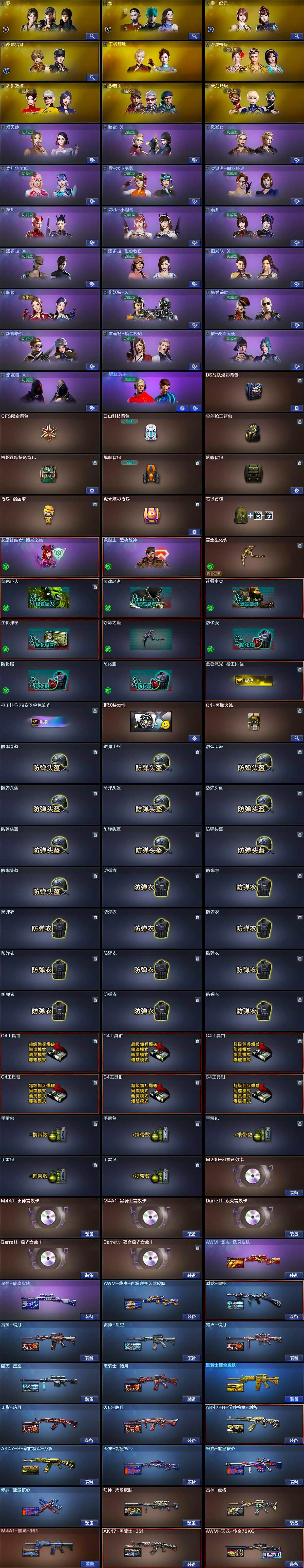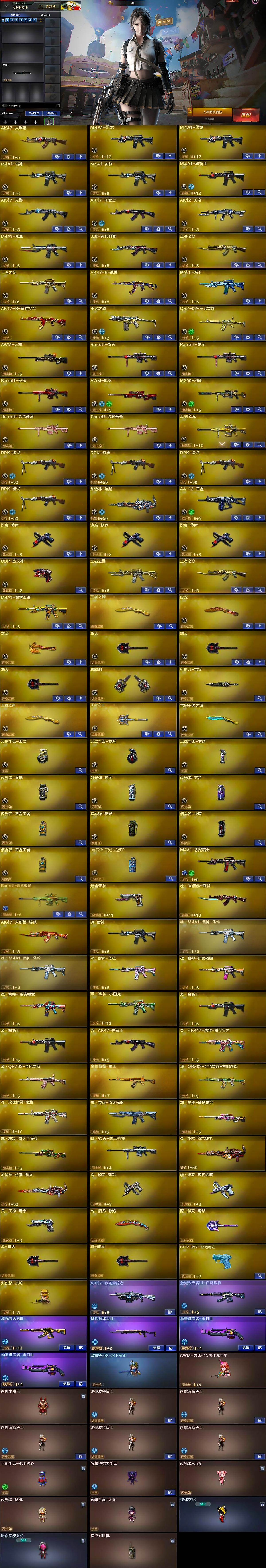 【英雄级武器】:AK47-火麒麟,M4A1-黑龙*2,M4A1-雷神*2,M4A1-黑骑士,AK47-无影,AK47-黑武士,AK12-天启,M4A1-龙血,无影-神兵利器,王者之心-觉醒版,王者之魄-觉醒版,AK47-B-战神,黑骑士-海王,AK47-B-常胜将军,王者之烈-觉醒版,QBZ-03-王者蔷薇-觉醒版,AWM-天龙,Barrett-毁灭*2,Barrett-极光,AWM-裁决,M200-幻神,Barrett-金色蔷薇*2,王