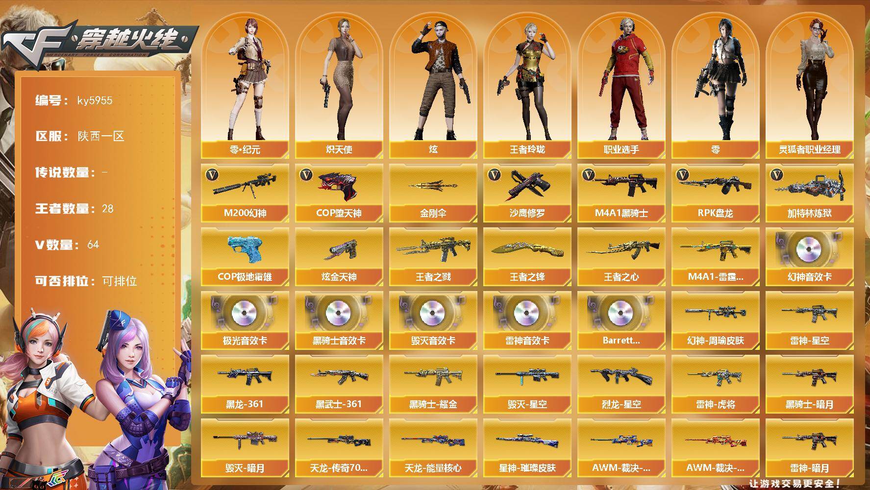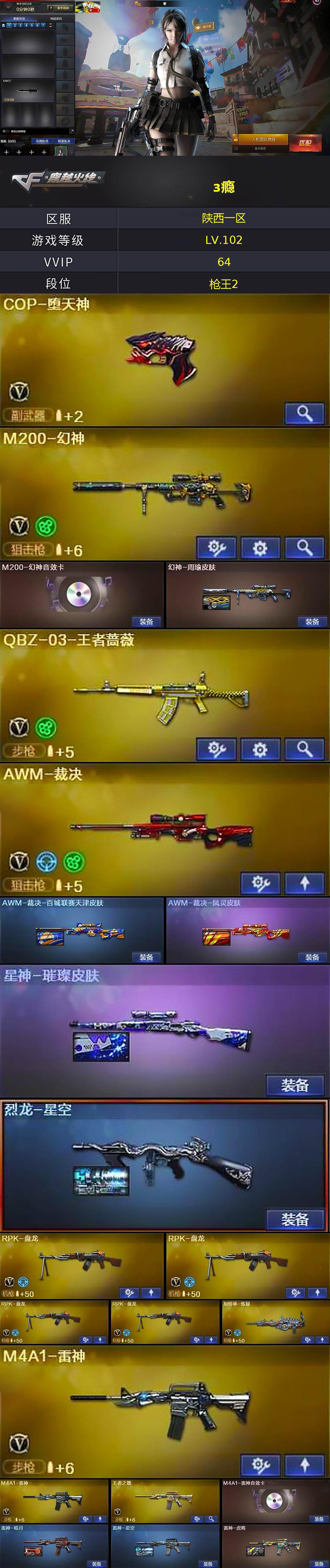 [17100095]陕西一区-79V-28王者武器数-1炫金武器数 【热门武器】:M200-幻神,M4A1-黑骑士,RPK-盘龙*4,加特林-炼狱,COP-堕天神,沙鹰-修罗*3,金刚伞,COP 357-极地霜雄 【王者炫金武器】:王者之戮,王者之心,M4A1-雷霆王者,王者之锋,炫金天神 【音效卡】:M200-幻神音效卡,M4A1-雷神音效卡,M4A1-黑骑士音效卡,Barrett-毁灭音效卡,Barrett-极光音效卡,Barrett-碧霄极光音效卡 【皮肤】:幻神-周瑜皮肤,AWM-裁决-百城联赛天津皮肤,AWM-裁决-凤灵皮肤,星神-璀璨皮肤,烈龙-星空,雷神-暗月,雷神-星空,雷神-虎将,毁灭-暗月,毁灭-星空,毁灭-英雄计划 皮肤,M4A1-黑龙-361,黑骑士-暗月,黑骑士耀金皮肤,无影-暗月,AK47-黑武士-361,天启-暗月,AK47-B-常胜将军-刘备,AK47-B-常胜将军-孙权,天龙-能量核心,AWM-天龙-传奇70KG,极光-能量核心,修罗-能量核心 【角色】:零,炫,零·纪元,战地猎狐,王者玲珑,奇洋探员,乔伊教练,修道士,云海玲珑,炽天使,暗夜-X,风暴女,嘉年华灵狐,零-水下丽影,灵狐者-职业经理,龙儿,龙儿-小淘气,萌儿,潘多拉-X,潘多拉-甜心教官,潜龙队-X,蛇姬,斯沃特-X,铁骑荣耀,新娜塔莎,雪莉杨-摸金校尉,樱-战斗天使,影武者-X,职业选手 【人偶武器】:火麒麟-灵狐,巴雷特-零-水下丽影,AWM-灵狐-15周年嘉年华,迷你牛魔王,迷你波特博士*5,生化手雷-机甲核心,深渊终结者手雷,闪光弹-小乔,闪光弹-貂蝉,高爆手雷-大乔,迷你艾比,迷你超能女侍 【暴走生化】:超级对讲机 【挑战大师】:AK47-冰龙粉碎者,激光毁灭者III-白马银枪,激光毁灭者III,试炼破坏者III,神圣爆裂者-末日III*2 【英雄级武器】:AK47-火麒麟,M4A1-黑龙*2,M4A1-雷神*2,M4A1-黑骑士,AK47-无影,AK47-黑武士,AK12-天启,M4A1-龙血,无影-神兵利器,王者之心-觉醒版,王者之魄-觉醒版,AK47-B-战神,黑骑士-海王,AK47-B-常胜将军,王者之烈-觉醒版,QBZ-03-王者蔷薇-觉醒版,AWM-天龙,Barrett-毁灭*2,Barrett-极光,AWM-裁决,M200-幻神,Barrett-金色蔷薇*2,王
