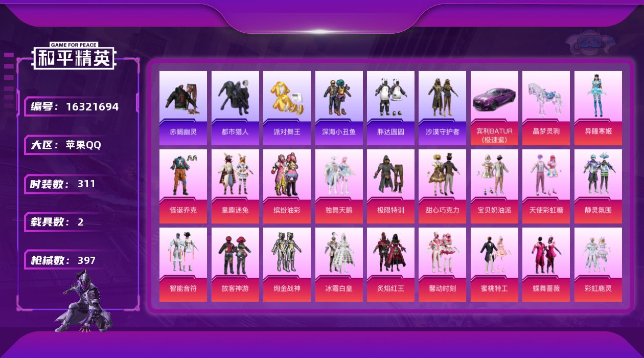 [16321694]苹果 手Q-49粉装-21特效枪-2载具-10粉色飞行器-157157热力值-20王牌印记-311套装-397枪皮