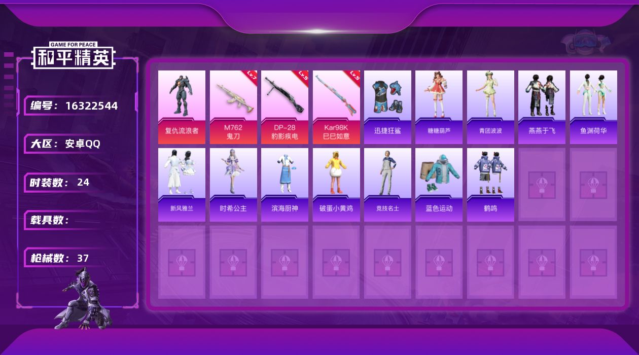 [16322544]安卓 手Q-2粉装-3特效枪-0载具-0粉色飞行器-13276热力值-1王牌印记-24套装-37枪皮 【粉色套装】:角色-复仇流浪者 【粉色枪皮等级】:M762-鬼刀(七级),Kar98K-巳巳如意(五级),DP-28-豹影疾电(五级) 【粉色枪皮】:M762-鬼刀,Kar98K-巳巳如意,DP-28-豹影疾电 【粉色降落伞】:千金淑猫降落伞,樱桃泡泡降落伞,星穹咏叹调降落伞 【稀有套装】:套装-糖糖葫芦,套装-青团波波,套装-燕燕于飞,套装-鱼渊荷华,套装-新风雅兰,角色-时希公主 【稀有枪皮】:M16A4-千金淑猫,SCAR-L-炫彩节奏,AC-VAL-天降萌叽,UZI-幻影飞狐,Mini14-绯穹魔姬,S1897-荧海星豚,S12K-玩趣呆呆,DBS-彩虹符号,DP-28-彩虹独角兽,蝎式手枪-千金淑猫,爆炸猎弓-雪月幻音 【其他套装】:套装-滨海厨神,套装-破蛋小黄鸡,套装-竞技名士,套装-蓝色运动,套装-鹤鸣,套装-迅捷狂鲨 【稀有背包】:金羽特工背包(1级) 【营地ID】:980309847
