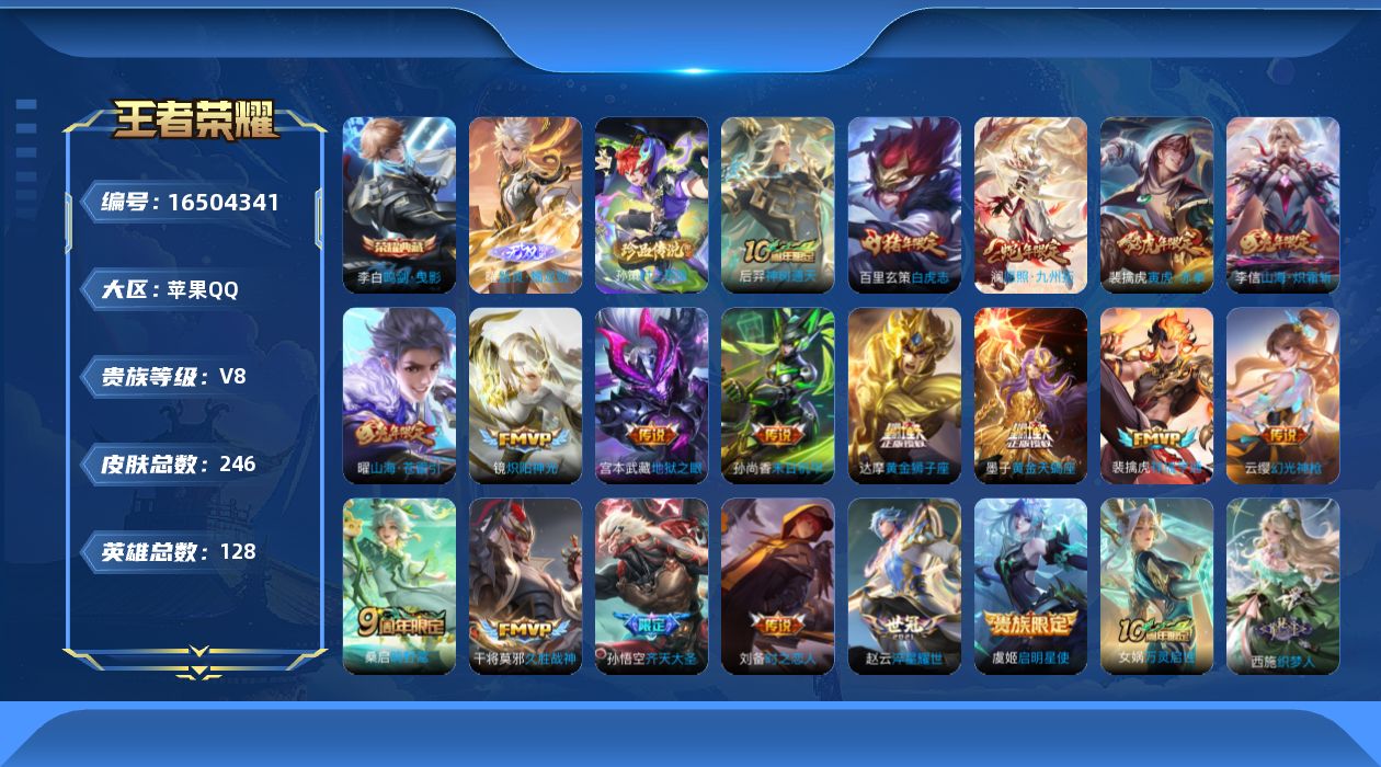 [16504341]野王号,百段打野,三大国,大国曹操,大国云中君,大国赵云,6小国,数字小国1兰陵王,数字国2老虎,小国玄策,李白,凯,刘备,万战韩信-苹果Q-V8-永恒钻石I段位-128英雄-246皮肤-1典藏皮肤-1无双-1珍品传说-19传说-58史诗,李白典藏,无双曜器灵螭龙剑,珍品孙策时之奇旅