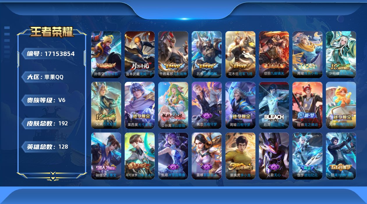 [17153854]苹果Q-192皮肤-1典藏皮肤-1珍品传说-3传说-59史诗 【英雄全皮】:敖隐全皮,空空儿全皮 【荣耀典藏】:孙悟空全息碎影 【珍品传说】:宫本武藏黑崎一护 【传说皮肤】:吕布怒海麟威,干将莫邪久胜战神,花木兰冠军飞将 【限定皮肤】:姜子牙天穹之誓,狄仁杰阴阳师,赵云皇家上将,孙尚香蔷薇恋人,庄周高山流水,高渐离死亡摇滚,元歌无心,马可波罗山海玄木吟,狄仁杰魔术师,项羽海滩派对,老夫子醍醐杖,老夫子航海奇遇记,孙悟空至尊宝,李元芳云中旅人,钟馗驱傩正仪,干将莫邪胡桃夹子,蔡文姬繁星吟游,鬼谷子原初探秘者,百里玄策原初追逐者,裴擒虎李小龙,裴擒虎擒涛扼浪,云中君纤云弄巧,嫦娥拒霜思,嫦娥暖冬兔眠,西施玲珑珍味,鲁班大师探海日志,桑启海盐诗旅,暃星界游侠,阿古朵江河有灵,张良古海寻踪,蒙犽百解令,蒙恬荣光圣徽,高渐离燃音魔法,妲己灵卜魔法,鬼谷子天穹祈灯,伽罗琥珀纪元,沈梦溪龙舞盛年,刘邦剑破天穹 【年限皮肤】:马可波罗山海玄木吟 【赛季限定】:老夫子醍醐杖,鬼谷子原初探秘者,钟馗驱傩正仪,李元芳云中旅人,桑启海盐诗旅,裴擒虎擒涛扼浪,鲁班大师探海日志,张良古海寻踪,鬼谷子天穹祈灯,刘邦剑破天穹,姜子牙天穹之誓,钟馗虚灵犬护,甄姬逆浪荇歌,亚瑟荣光之誓,百里玄策原初追逐者,蒙恬荣光圣徽,项羽九幽镇关 【战令限定】:老夫子航海奇遇记,暃星界游侠,嫦娥暖冬兔眠,西施玲珑珍味,高渐离燃音魔法,妲己灵卜魔法,刘禅鸭鸭历险记,沈梦溪鸭鸭历险记,周瑜百相守梦,孙策百相守梦,莱西奥光弋星穹,明世隐往忆晖光,周瑜线条小狗 【史诗皮肤】:周瑜线条小狗,项羽九幽镇关,少司缘巫礼祀神,女娲万灵启世,莱西奥光弋星穹,公孙离涂山容容,黄忠百相守梦,周瑜百相守梦,后羿石田雨龙,狂铁龙之律动,刘禅鸭鸭历险记,姬小满战舞者,伽罗琥珀纪元,蒙恬荣光圣徽,高渐离燃音魔法,妲己灵卜魔法,蒙犽百解令,阿古朵江河有灵,刘禅电玩爆裂旋风,马可波罗山海玄木吟,暃星界游侠,元歌无心,嫦娥拒霜思,庄周高山流水,杨戬天秀启明,老夫子航海奇遇记,云中君纤云弄巧,裴擒虎李小龙,百里玄策原初追逐者,蔡文姬繁星吟游,狄仁杰鹰眼统帅,孙策猫狗日记,阿轲节奏热浪,程咬金功夫厨神,李元芳逐浪之夏,铠曙光守护者,雅典娜冰冠公主,亚瑟心灵战警,诸葛亮黄金分割率,兰陵王暗隐猎兽者,小乔缤纷独角兽,夏侯惇乘风破浪,花木兰水晶猎龙者,孙悟空
