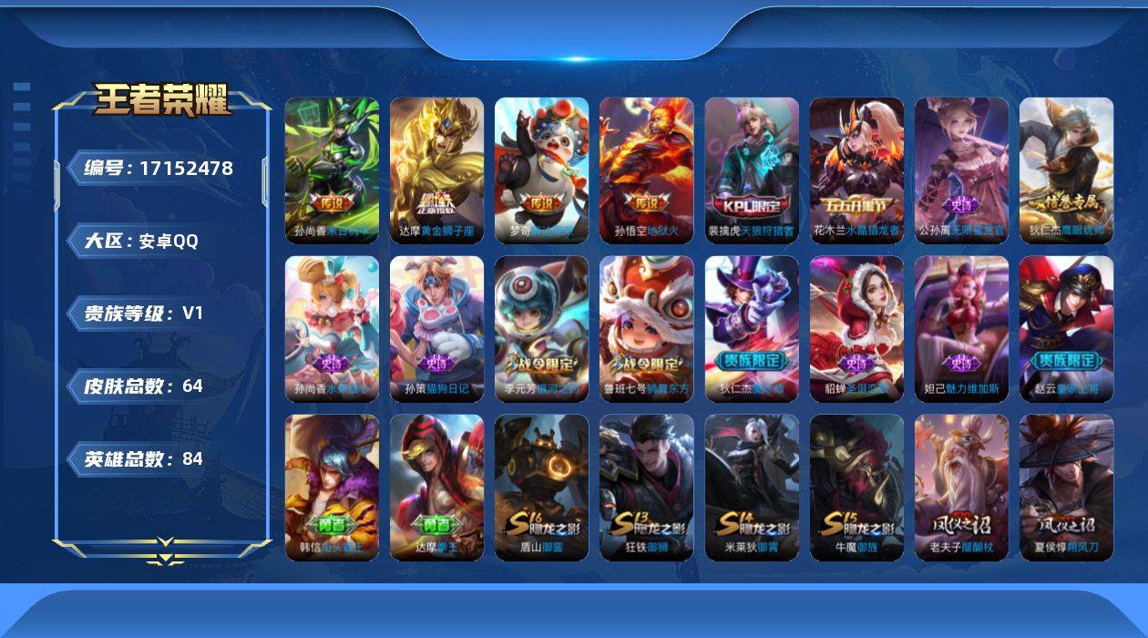 - [12142646]V9 5典藏 22传说 126英雄 341皮肤 可修改实名 优质装备:无限飓风号(高达),全息碎影(猴子典藏),九霄神辉(木兰典藏),赤影疾锋,银白咏叹调(倪克斯侍卫),黄金狮子座,冠军飞将,云鹰飞将(小将军),久胜战神,一念神魔,地狱之眼,音你心动-周瑜,挚爱之约,无双飞将,山海·炽霜斩(李信年限),山海·苍雷引(电光曜子),浮生妄,遇见神鼓,黄金天蝎座,涂山容容 传说皮:乘龙·问璇玑(孙尚香年限),乘龙·铭钟鼎(赵云年限),吕布曦玄引 珍宝阁皮:玩趣恶龙 限定皮:愿照·山河定(司空震年限),逐霄战戟,鸣野蒿,怒海麟威,五谷丰年,御风骁将(吕布年限),龙胆,李小龙,玄武志(苏烈年限),朱雀志(守约年限),如梦令-后羿,孙行者,天魔缭乱,美猴王 史诗皮:鸭鸭历险记-刘禅,苍鳞隐世,器灵·浮梦炉,化蝶舞,星界战将,龙之律动,石田雨龙,茶境仙,怒海争锋,芈月浮光幕影,琥珀纪元伽罗,蔬乡物语(鲁班七号),百相守梦-百里守约,紫霞仙子,苍穹之光,千年之狐,永昼,江河有灵,雪夜绮愿(周瑜),魅语,百解令(蒙犽),高渐离燃音魔法,蒙恬荣光圣徽,冰冠公主,偶像歌手,白蛇,龙骑士(小龙虾),末日机甲-吕布,猫狗日记-孙策,猫狗日记-大乔,乱世虎臣,节奏热浪,修罗,女仆咖啡,摇滚巨星,水果甜心,绅士熊喵,天才门将,星夜王子,心灵骇客,功夫厨神,德古拉伯爵,暗隐猎兽者,幽灵船长,鬼剑武藏,心灵战警,乐园奇幻夜,天秀·启明,地狱岩魂,纤云弄巧,拒霜思,缤纷独角兽,乘风破浪,逐浪之夏,水晶猎龙者,曙光守护者,箭羽风息,金属风暴,原初追逐者,圣诞狂欢,圣诞恋歌,鹰眼统帅,暗夜贵公子,魅力维加斯,黎明之约,未来纪元-赵云
