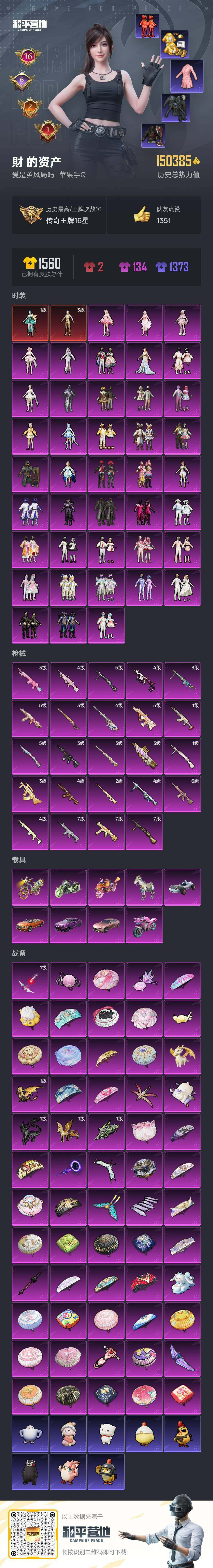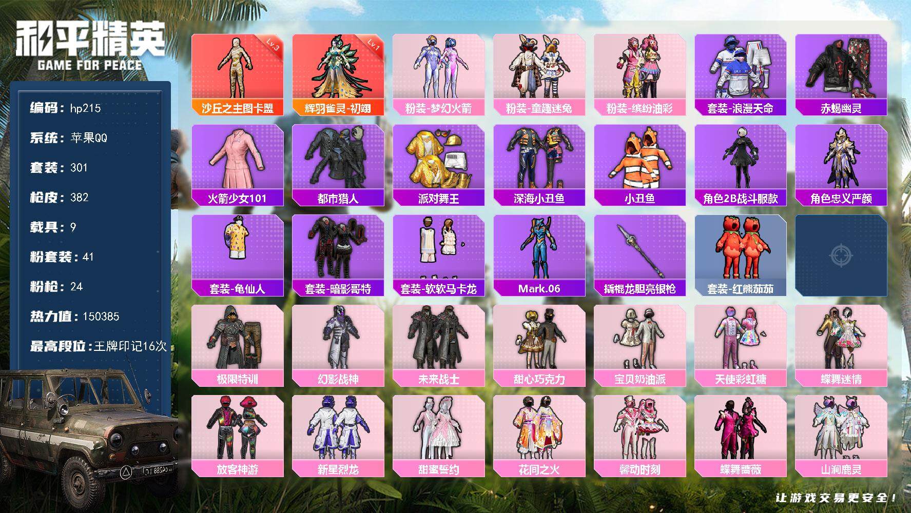 [16818116]苹果 手Q-2神装-41粉装-24特效枪-9载具-18粉色飞行器-150385热力值-16王牌印记-301套装-382枪皮