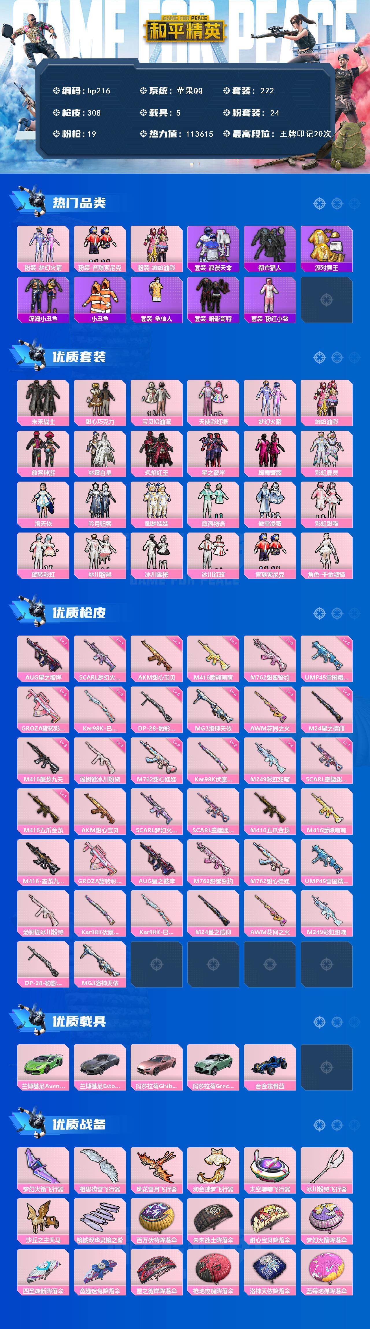 [17155850]苹果 手Q-24粉装-19特效枪-5载具-8粉色飞行器-113615热力值-20王牌印记-222套装-308枪皮 【热门品类】:粉装-梦幻火箭,粉装-音爆索尼克,粉装-缤纷油彩,套装-浪漫天命,套装-都市猎人,套装-派对舞王,套装-深海小丑鱼,套装-小丑鱼,套装-龟仙人,套装-暗影哥特,套装-粉红小猪 【粉色套装】:粉装-未来战士,粉装-甜心巧克力,粉装-宝贝奶油派,粉装-天使彩虹糖,粉装-梦幻火箭,粉装-缤纷油彩,粉装-放客神游,粉装-冰霜白皇,粉装-炙焰红王,粉装-星之彼岸,粉装-蝶舞蔷薇,粉装-彩虹鹿灵,角色-洛天依,粉装-吟月归客,粉装-酣梦娃娃,粉装-薄荷物语,粉装-傲雪凌霜,粉装-彩虹甜喵,粉装-旋转彩虹,粉装-冰川粉黛,粉装-冰川幽秘,粉装-冰川红玫,粉装-音爆索尼克,角色-千金淑猫 【粉色枪皮等级】:AKM-甜心宝贝(七级),SCAR-L-梦幻火箭(七级),SCAR-L-童趣迷兔(一级),M416-五爪金龙(一级),M416-暖熊萌萌(七级),M416-墨龙九天(三级),GROZA-旋转彩虹(五级),AUG-星之彼岸(七级),M762-甜蜜誓约(五级),M762-甜心娃娃(二级),UMP45-雪国精灵(五级),汤姆逊-冰川粉黛(三级),Kar98K-伏魔团(二级),Kar98K-巳巳如意(五级),M24-星之信仰(三级),AWM-花间之火(四级),M249-彩虹甜喵(二级),DP-28-豹影疾电(五级),MG3-洛神天依(四级) 【粉色载具】:兰博基尼Aventador SVJ(翡翠绿),兰博基尼Estoque(银翼灰),玛莎拉蒂Ghibli(粉),玛莎拉蒂Grecale(薄荷绿),合金龙骨(蓝) 【粉色枪皮】:AKM-甜心宝贝,SCAR-L-梦幻火箭,SCAR-L-童趣迷兔,M416-五爪金龙,M416-暖熊萌萌,M416-墨龙九天,GROZA-旋转彩虹,AUG-星之彼岸,M762-甜蜜誓约,M762-甜心娃娃,UMP45-雪国精灵,汤姆逊-冰川粉黛,Kar98K-伏魔团,Kar98K-巳巳如意,M24-星之信仰,AWM-花间之火,M249-彩虹甜喵,DP-28-豹影疾电,MG3-洛神天依 【粉色飞行器】:梦幻火箭飞行器,相思残雪飞行器,风花雪月飞行器,绚金瑰梦飞行器,太空嘟嘟飞行器,冰川粉黛飞行器,沙丘之主天马,镜域双华-灵镜之阶 【粉色降落伞