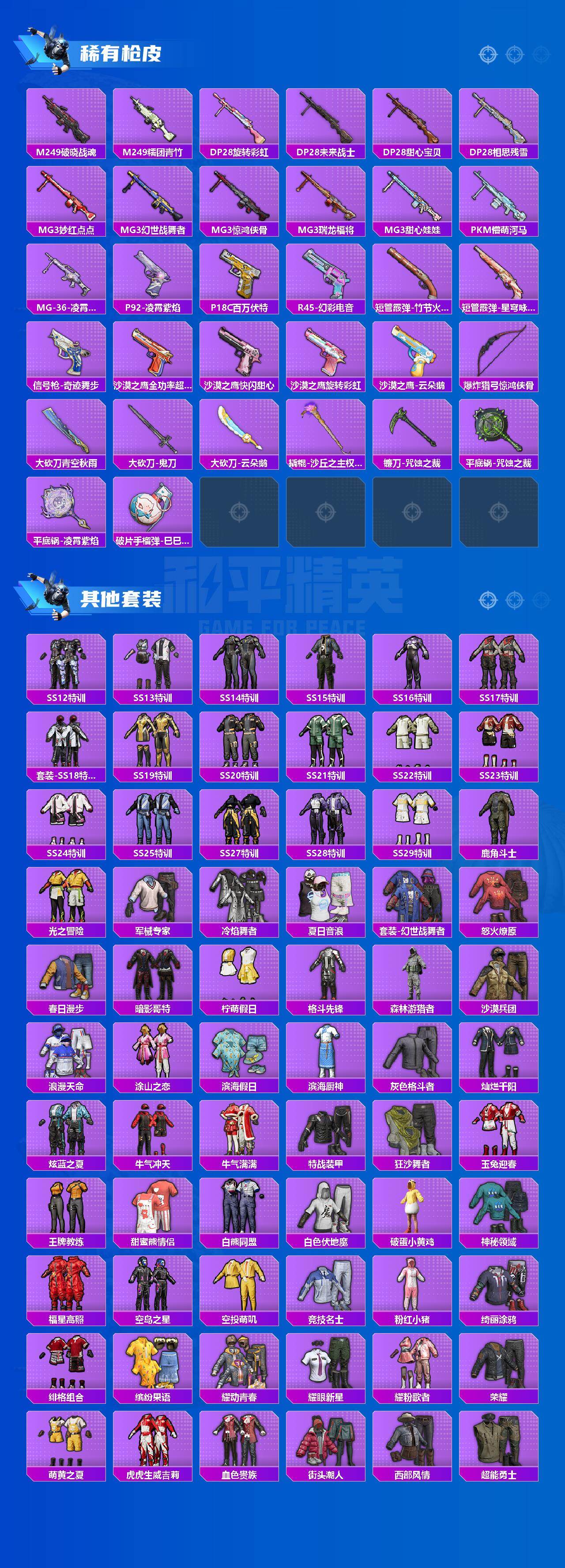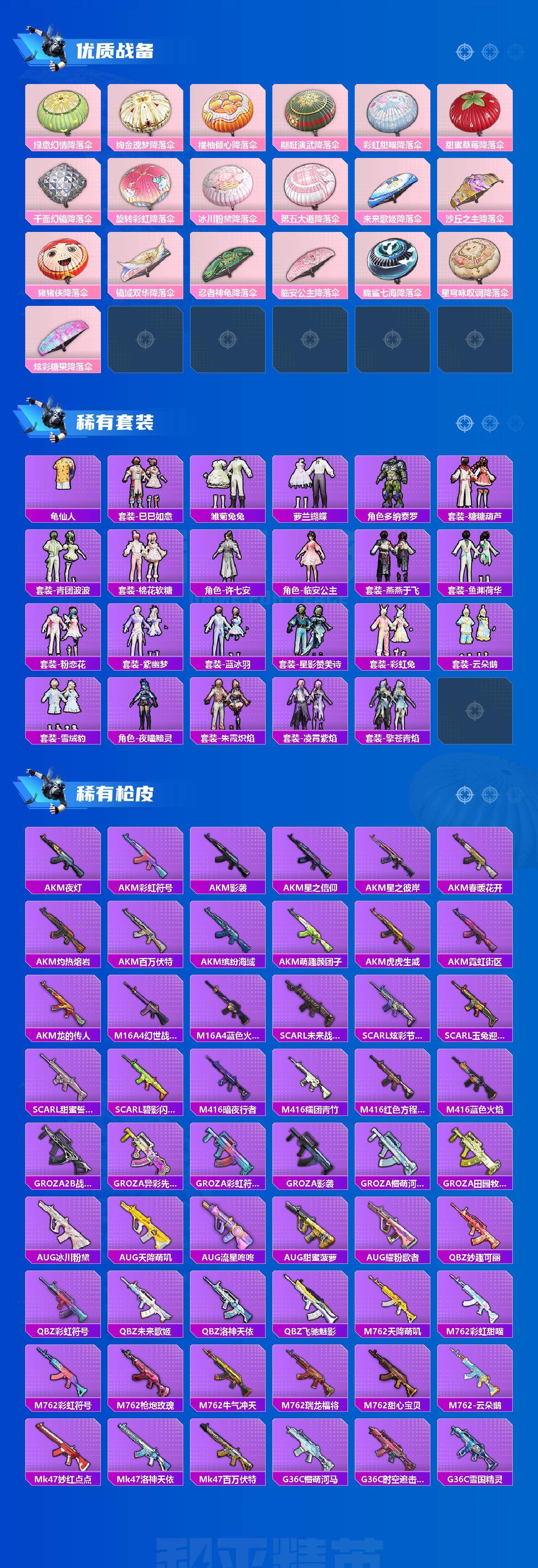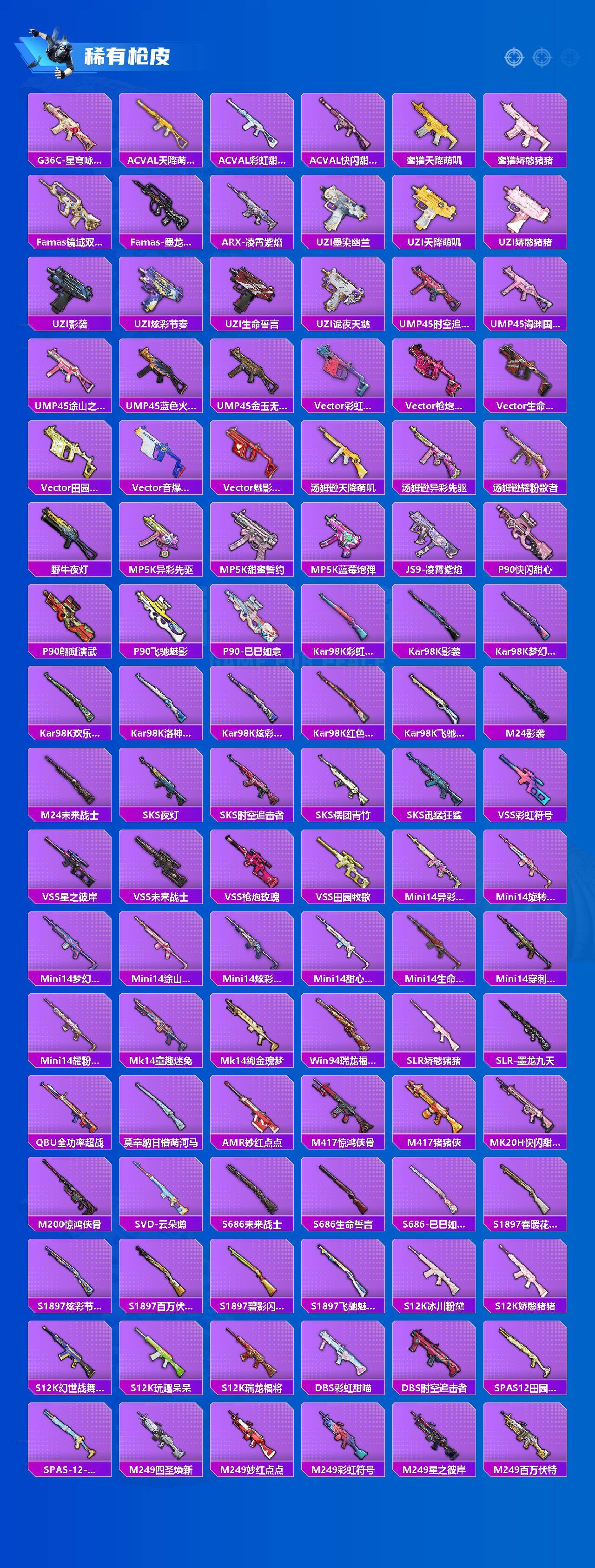 AKM-甜心宝贝,SCAR-L-梦幻火箭,SCAR-L-童趣迷兔,M416-五爪金龙,M416-暖熊萌萌,M416-墨龙九天,GROZA-旋转彩虹,AUG-星之彼岸,M762-甜蜜誓约,M762-甜心娃娃,UMP45-雪国精灵,汤姆逊-冰川粉黛,Kar98K-伏魔团,Kar98K-巳巳如意,M24-星之信仰,AWM-花间之火,M249-彩虹甜喵,MG3-洛神天依