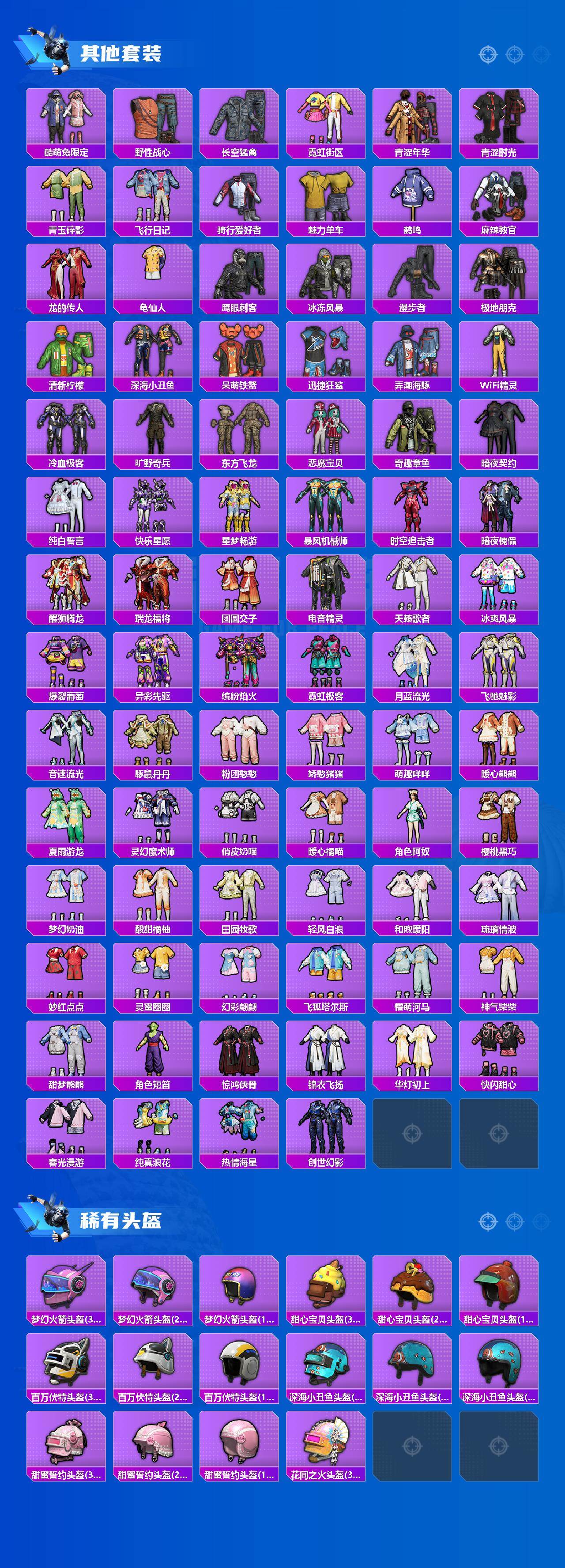 套装-梦幻火箭,套装-音爆索尼克,套装-缤纷油彩,套装-都市猎人,套装-派对舞王,套装-深海小丑鱼,套装-未来战士,套装-宝贝奶油派,套装-天使彩虹糖,套装-放客神游,套装-炙焰红王,套装-星之彼岸,套装-蝶舞蔷薇,套装-彩虹鹿灵,角色-洛天依,套装-吟月归客,套装-酣梦娃娃,套装-薄荷物语,套装-傲雪凌霜,套装-彩虹甜喵,套装-旋转彩虹,套装-冰川粉黛,套装-冰川幽秘,套装-冰川红玫,角色-千金淑猫,套装-鹰眼刺客,套装-呆萌铁蟹,套装-迅捷狂鲨,套装-东方飞龙