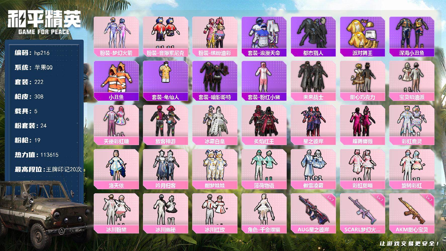[17155850]苹果 手Q-24粉装-19特效枪-5载具-8粉色飞行器-113615热力值-20王牌印记-222套装-308枪皮