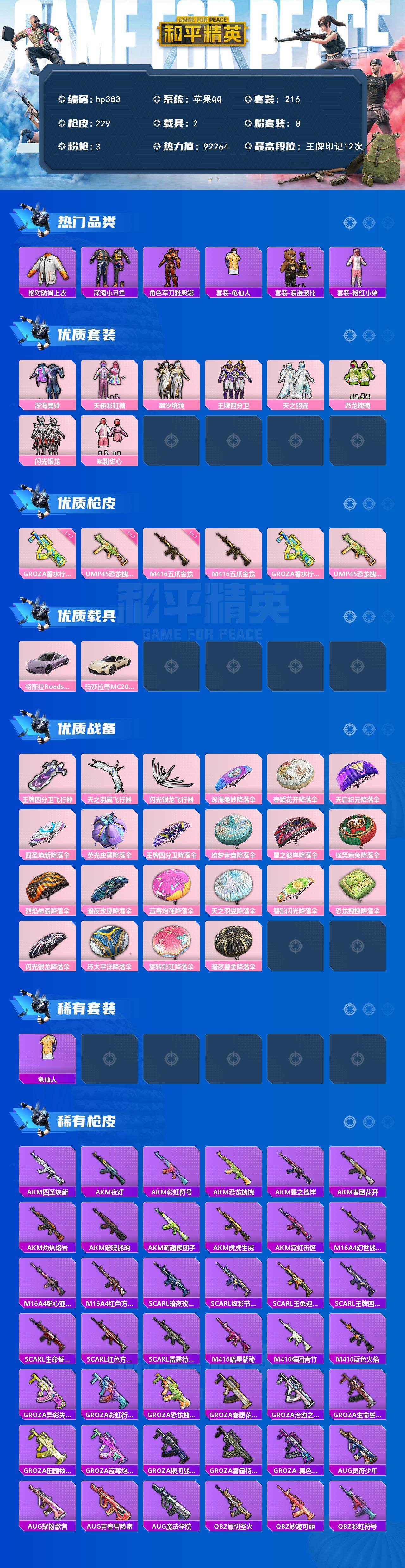 [17155962]苹果 手Q-8粉装-3特效枪-2载具-3粉色飞行器-92264热力值-12王牌印记-216套装-229枪皮 【热门品类】:绝对防御上衣,套装-深海小丑鱼,角色-军刀雅典娜,套装-龟仙人,套装-浪漫波比,套装-粉红小猪 【粉色套装】:粉装-深海曼妙,粉装-天使彩虹糖,粉装-潮汐统领,粉装-王牌四分卫,粉装-天之羽翼,粉装-恐龙拽拽,粉装-闪光银龙,粉装-飒粉甜心 【粉色枪皮等级】:M416-五爪金龙(七级),GROZA-香水柠檬(七级),UMP45-恐龙拽拽(七级) 【粉色载具】:特斯拉Roadster(沁心粉),玛莎拉蒂MC20(星石白) 【粉色枪皮】:M416-五爪金龙,GROZA-香水柠檬,UMP45-恐龙拽拽 【粉色飞行器】:王牌四分卫飞行器,天之羽翼飞行器,闪光银龙飞行器 【粉色降落伞】:深海曼妙降落伞,春暖花开降落伞,天启纪元降落伞,四圣焕新降落伞,荧光虫舞降落伞,王牌四分卫降落伞,绮梦青鸾降落伞,星之彼岸降落伞,怪笑疯兔降落伞,烈焰拳霸降落伞,暗夜玫瑰降落伞,蓝莓炮弹降落伞,天之羽翼降落伞,碧影闪光降落伞,恐龙拽拽降落伞,闪光银龙降落伞,环太平洋降落伞,旋转彩虹降落伞,暗夜鎏金降落伞 【稀有套装】:套装-龟仙人 【稀有枪皮】:AKM-四圣焕新,AKM-夜灯,AKM-彩虹符号,AKM-恐龙拽拽,AKM-星之彼岸,AKM-春暖花开,AKM-灼热熔岩,AKM-破晓战魂,AKM-萌趣颜团子,AKM-虎虎生威,AKM-霓虹街区,M16A4-幻世战舞者,M16A4-甜心亚梦,M16A4-红色方程式,SCAR-L-暗夜玫瑰,SCAR-L-炫彩节奏,SCAR-L-玉兔迎春,SCAR-L-王牌四分卫,SCAR-L-生命誓言,SCAR-L-红色方程式,SCAR-L-雷霆特警,M416-暗星紫秘,M416-糯团青竹,M416-蓝色火焰,GROZA-异彩先驱,GROZA-彩虹符号,GROZA-恐龙拽拽,GROZA-春暖花开,GROZA-治愈之星,GROZA-生命誓言,GROZA-田园牧歌,GROZA-蓝莓炮弹,GROZA-银河战甲,GROZA-雷霆特警,GROZA-黑色刀锋,AUG-灵符少年,AUG-耀粉歌者,AUG-青春冒险家,AUG-魔法学院,QBZ-原初圣火,QBZ-妙趣可丽,QBZ-彩虹符号,QBZ-诡娃娃,QBZ-赛罗,QBZ-飞驰魅影,M762-天降萌叽,M762