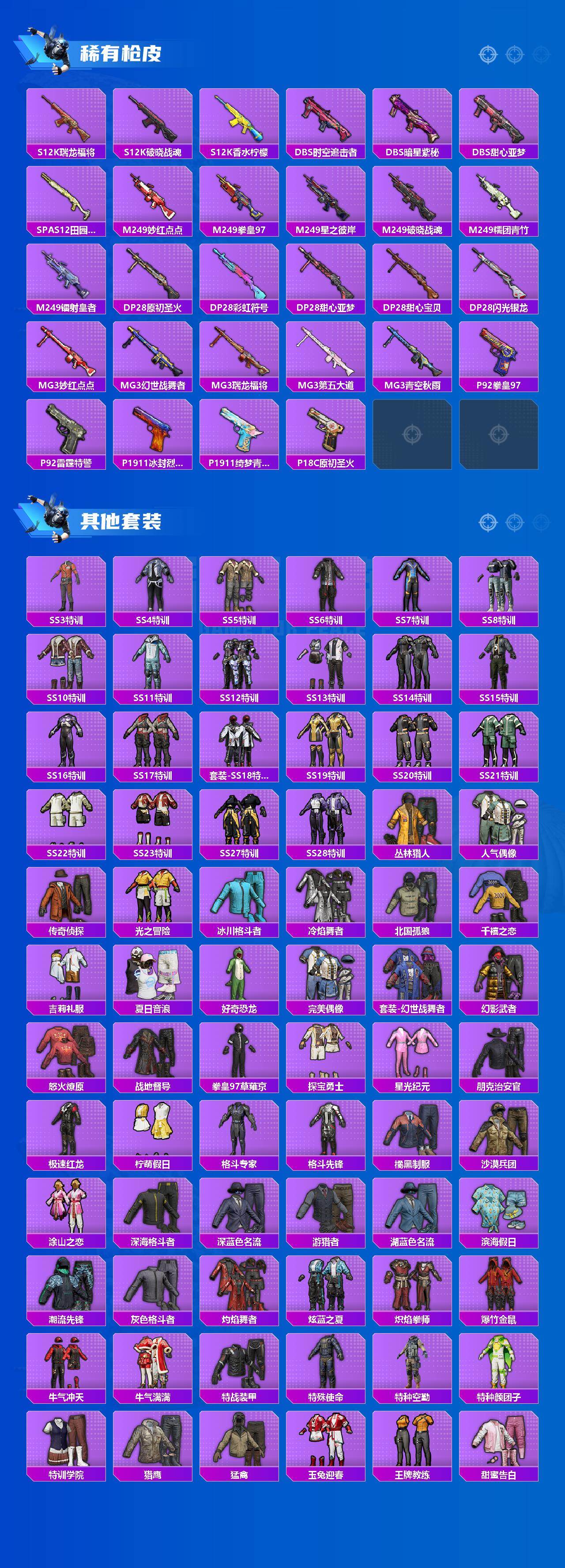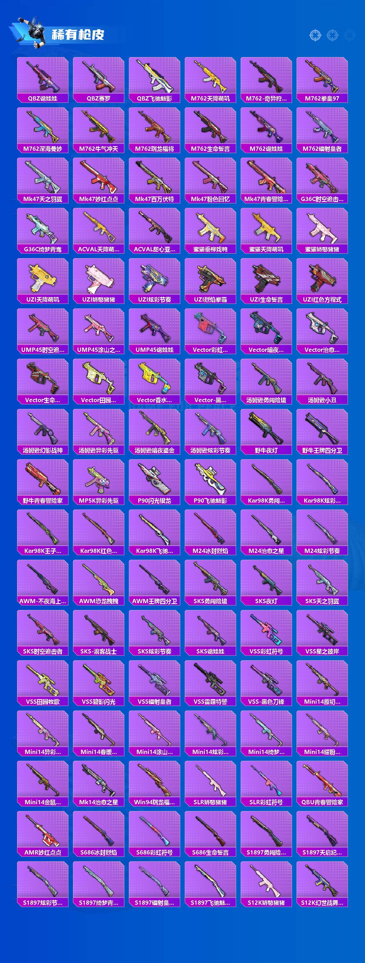 【稀有枪皮】:AKM-四圣焕新,AKM-夜灯,AKM-彩虹符号,AKM-恐龙拽拽,AKM-星之彼岸,AKM-春暖花开,AKM-灼热熔岩,AKM-破晓战魂,AKM-萌趣颜团子,AKM-虎虎生威,AKM-霓虹街区,M16A4-幻世战舞者,M16A4-甜心亚梦,M16A4-红色方程式,SCAR-L-暗夜玫瑰,SCAR-L-炫彩节奏,SCAR-L-玉兔迎春,SCAR-L-王牌四分卫,SCAR-L-生命誓言,SCAR-L-红色方程式,SCAR-L-雷霆特警,M416-暗星紫秘,M416-糯团青竹,M416-蓝色火焰,GROZA-异彩先驱,GROZA-彩虹符号,GROZA-恐龙拽拽,GROZA-春暖花开,GROZA-治愈之星,GROZA-生命誓言,GROZA-田园牧歌,GROZA-蓝莓炮弹,GROZA-银河战甲,GROZA-雷霆特警,GROZA-黑色刀锋,AUG-灵符少年,AUG-耀粉歌者,AUG-青春冒险家,AUG-魔法学院,QBZ-原初圣火,QBZ-妙趣可丽,QBZ-彩虹符号,QBZ-诡娃娃,QBZ-赛罗,QBZ-飞驰魅影,M762-天降萌叽,M762