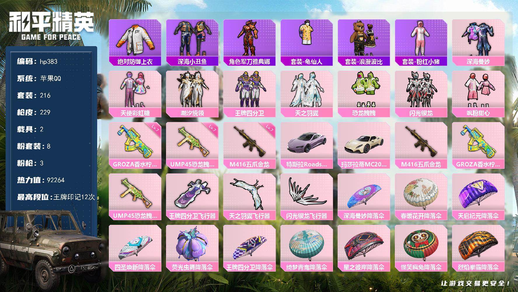 [17155962]苹果 手Q-8粉装-3特效枪-2载具-3粉色飞行器-92264热力值-12王牌印记-216套装-229枪皮