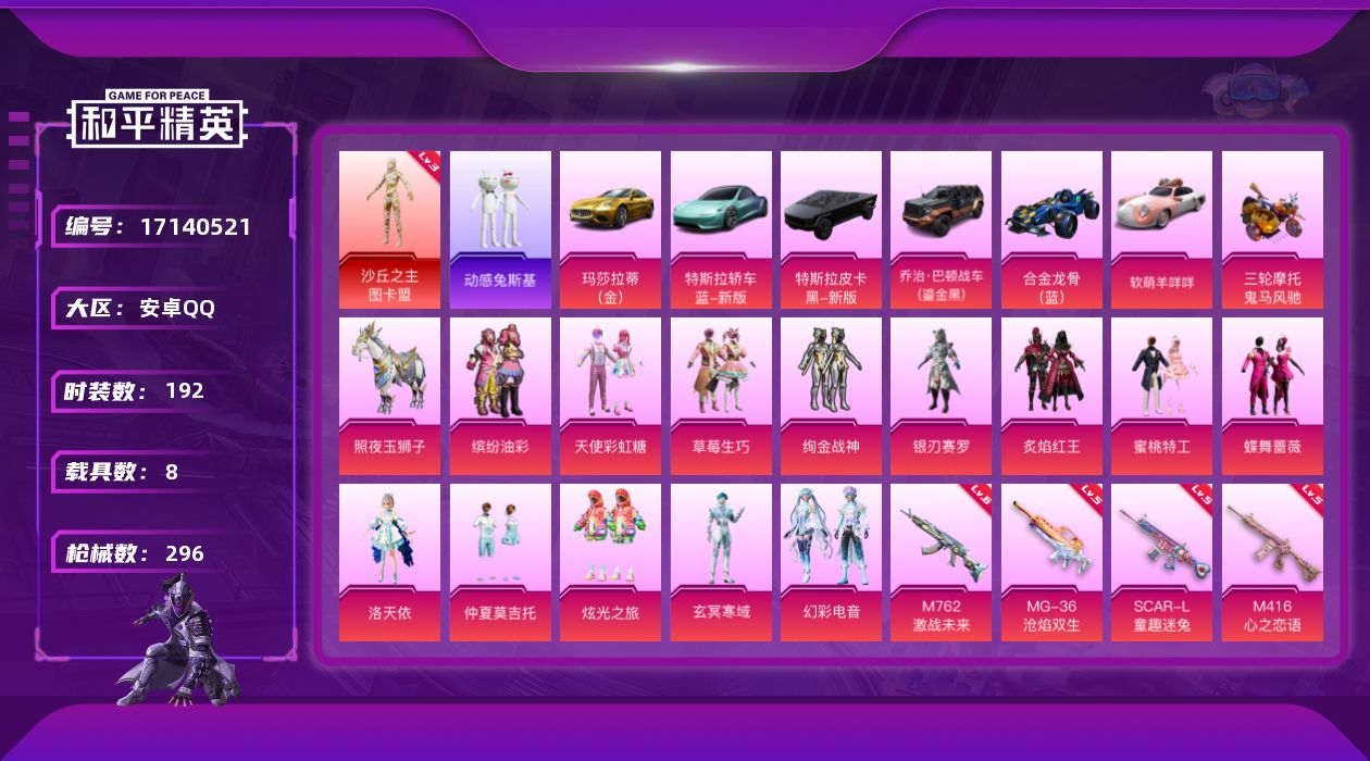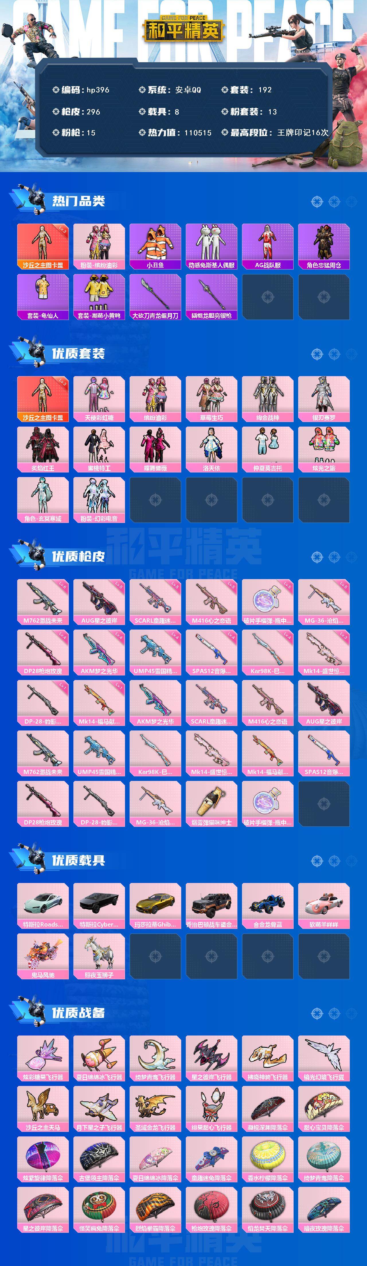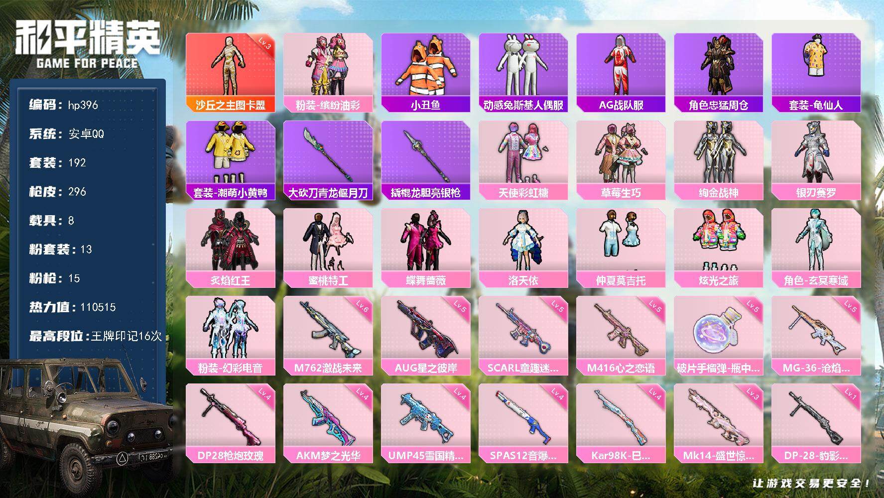[17140521]安卓 手Q-1神装-13粉装-15特效枪-8载具-10粉色飞行器-110515热力值-16王牌印记-192套装-296枪皮