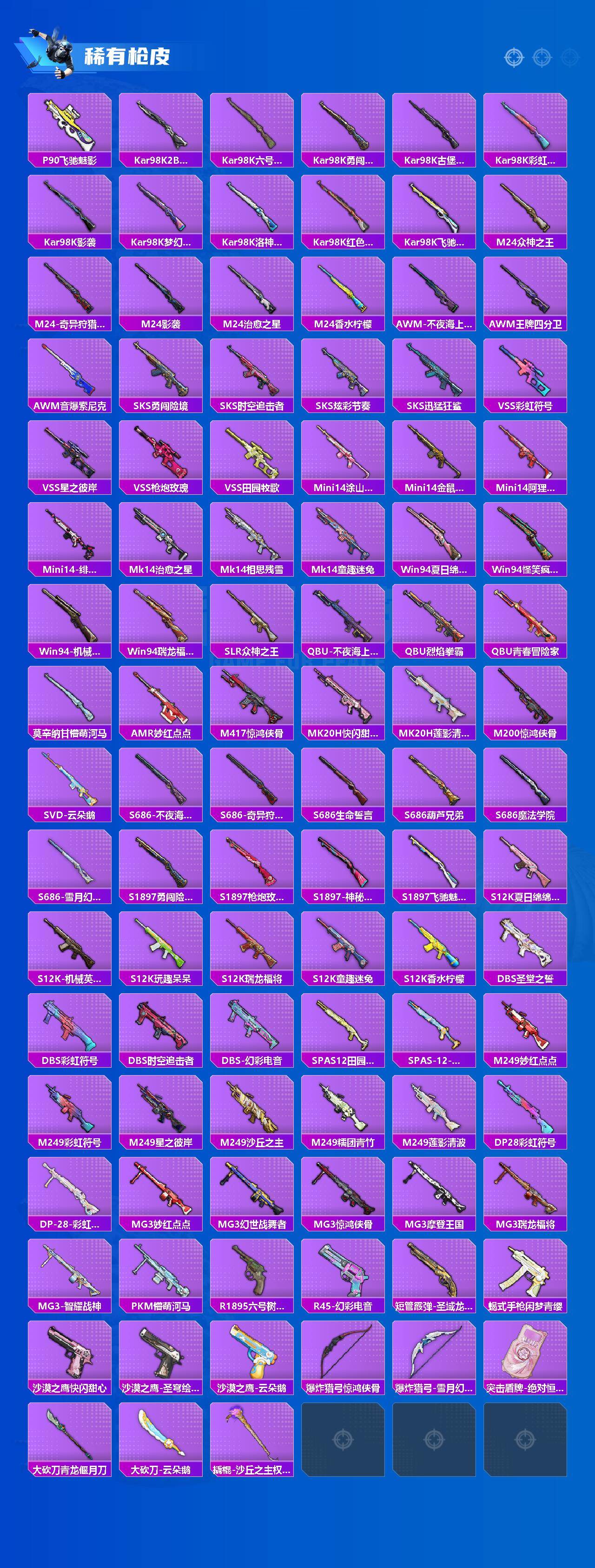 【粉色枪皮】:AKM-梦之光华,SCAR-L-童趣迷兔,M416-心之恋语,AUG-星之彼岸,M762-激战未来,UMP45-雪国精灵,Kar98K-巳巳如意,Mk14-盛世惊鸿,Mk14-福马献瑞,SPAS-12-音爆索尼克,DP-28-枪炮玫瑰,DP-28-豹影疾电,MG-36-沧焰双生,烟雾弹-猫咪绅士,破片手榴弹-瓶中星球