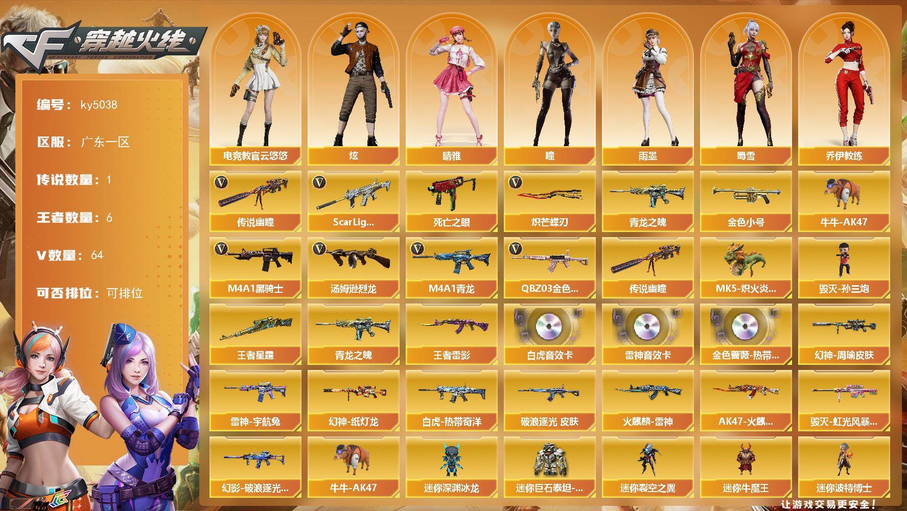 [17002180]广东一区-64V-6王者-0炫金 【传说武器】:传说幽瞳 【热门武器】:传说幽瞳,QBZ03-金色蔷薇,Scar Light-白虎,M4A1-青龙,死亡之眼,青龙之魄,金色小号,牛牛-AK47,M4A1-黑骑士*3,汤姆逊-烈龙*6,MK5-炽火炎龙,毁灭-孙三炮,炽芒蝶刃 【王者炫金武器】:青龙之魄,王者雷影,王者星霆 【音效卡】:QBZ03-金色蔷薇-热带奇洋音效卡,M4A1-雷神音效卡,Scar Light-白虎音效卡 【皮肤】:幻神-周瑜皮肤,幻神-纸灯龙皮肤,白虎-热带奇洋 皮肤,金色蔷薇-破浪逐光 皮肤,雷神-宇航兔皮肤,火麒麟-雷神,AK47-火麒麟-百城23冠军皮肤,毁灭-虹光风暴 皮肤,幻影-破浪逐光 皮肤 【角色】:瞳,炫,电竞教官-云悠悠,晴雅,雨墨,奇洋探员,乔伊教练,修道士,暗夜-X,北极狐-X,电竞少女,飞虎队-X,嘉年华灵狐,荆棘玫瑰,麻雀,曼陀罗-X,潜龙队-X,蛇姬,斯沃特-X,蜀雪,兔囡囡,新娜塔莎,雪莉杨-摸金校尉,游珑儿 【人偶武器】:毁灭-孙三炮,MK5-炽火炎龙,牛牛-AK47,迷你深渊冰龙,迷你裂空之翼*2,迷你牛魔王,迷你波特博士,迷你曼提柯尔,夺魂,迷你牛牛,迷你火种*3,生化手雷-机甲核心*5,深渊终结者手雷*2,迷你巨石泰坦-魔花研究所,灵狐娃娃手雷*2 【暴走生化】:死亡之眼,超级对讲机 【挑战大师】:冰龙粉碎者-白马银枪,激光毁灭者III-白马银枪*2,VEPR-12-金魔,激光毁灭者III,机甲撕裂者III,试炼破坏者III,KAC-圣炎切割者III,神圣爆裂者-末日III,惩戒者III 【英雄级武器】:AK47-火麒麟,M4A1-雷神,M4A1-黑骑士*3,AK12-天启,M4A1-青龙,Scar Light-白虎,QBZ03-天罚,无影-神兵利器,QBZ03-云龙,黑武士-锦绣游龙,超新星-热带奇洋,QBZ03-金色蔷薇,烈火-动感闪耀,王者之势-觉醒版*2,黑骑士-海王,王者芳薇-觉醒版,AWM-裁决,VSK-94-金蚀,汤姆逊-烈龙*6,COP-雷霆,天神-动感闪耀,屠龙*2,麒麟刺,炽芒蝶刃,屠龙-动感闪耀,龙啸-热带奇洋,高爆手雷-雷霆*5,高爆手雷-竞技荣光,手雷-动感闪耀,高爆手雷-云龙*2,手雷-热带奇洋,闪光弹-雷霆*6,闪光弹-竞技荣光,闪光弹-云龙*2,烟雾弹-雷霆*5,烟雾弹-竞