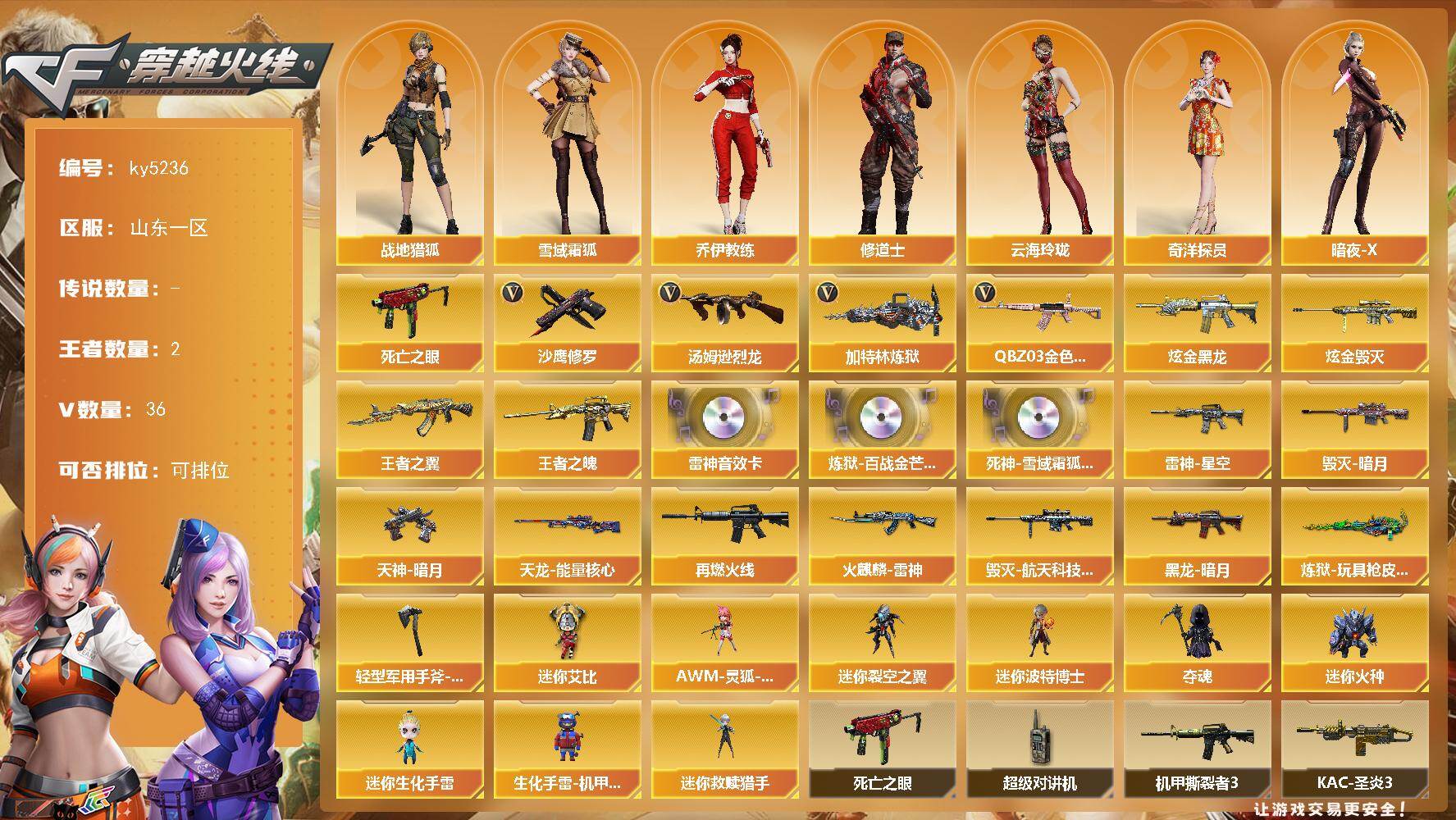 [16879697]山东一区-36V-2王者-3炫金 【热门武器】:QBZ03-金色蔷薇,死亡之眼,汤姆逊-烈龙,加特林-炼狱*2,沙鹰-修罗*2 【王者炫金武器】:王者之翼,王者之魄,炫金黑龙*2,炫金毁灭 【音效卡】:M4A1-雷神音效卡,炼狱-百战金芒-庆典舞曲音效卡,死神-雪域霜狐-怀旧音效卡 【皮肤】:雷神-星空,M4A1-再燃火线,火麒麟-雷神,毁灭-暗月,毁灭-航天科技皮肤,黑龙-暗月,天龙-能量核心,炼狱-玩具枪皮肤,天神-暗月,轻型军用手斧-再燃火线 【角色】:战地猎狐,雪域霜狐,奇洋探员,乔伊教练,修道士,云海玲珑,暗夜-X,北极狐-X,初恋灵狐,芳心审判者,风暴女,嘉年华灵狐,娟娟,兰-海滩派对,麻雀,曼陀罗-X,潘多拉-甜心教官,潜龙队-X,新娜塔莎,影武者-X,智影 【人偶武器】:迷你救赎猎手,AWM-灵狐-15周年嘉年华,迷你裂空之翼*2,迷你波特博士*4,夺魂,迷你火种*2,迷你生化手雷,生化手雷-机甲核心*3,迷你艾比 【暴走生化】:死亡之眼,超级对讲机 【挑战大师】:冰龙粉碎者-白马银枪,激光毁灭者III,机甲撕裂者III,试炼破坏者III*2,KAC-圣炎切割者III,惩戒者III 【英雄级武器】:M4A1-黑龙,M4A1-雷神,AN94-超新星,M4A1-武圣,AK47-黑鲨,黑武士-锦绣游龙,QBZ03-金色蔷薇,AK-47-猩红传说,黑骑士-海王,AWM-天龙,Barrett-毁灭*4,加特林-炼狱*2,炼狱-百战金芒,汤姆逊-烈龙,沙鹰-修罗*2,沙鹰-天神*3,Glock18-武圣,屠龙,麒麟刺*2,麒麟刺-百战金芒,烟雾弹-玄豹,M4A1-赤狱骑士 【道具】:BS战队炫彩背包,云山科技背包,亚洲杯纪念炫彩背包,奇洋探员-海龟背包,女皇终结者-背包,次元之矛-黄金背包,次元之矛-背包,炫彩背包-诺拉,炫彩背包,白狐背包,百战金芒炫彩背包,背包-洛丽塔,雪域霜狐炫彩背包,黄金曼提柯尔的背包,女皇终结者-魔龙之吻,救世主-黑桃战神,黄金生化钩,绿色巨人,灵魂忍者*2,变异宝贝,迷雾幽灵*2,夺命之镰,防化服*3,金色流光-枪王排位,流光-鎏金之域,流光-再燃火线,枪王排位29赛季金色流光,语音特效-盛典烟火,语音特效-怀旧,雪域霜狐表情,萌萌小葵表情,防弹头盔*4,防弹衣*4,C4工具钳*4,手雷包*4 【特殊枪械】:1烈龙,2炼狱