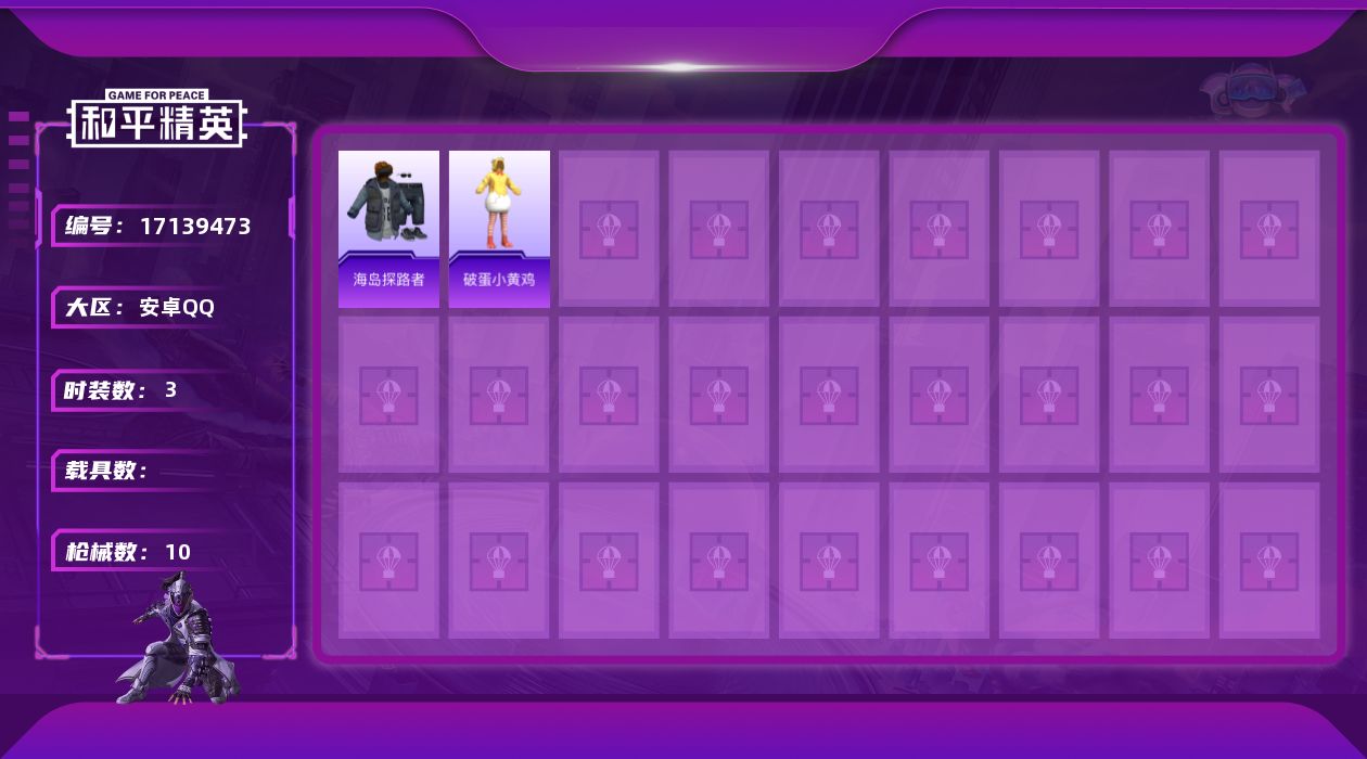 [17139473]安卓 手Q-0粉装-0特效枪-0载具-0粉色飞行器-2110热力值-0王牌印记-3套装-10枪皮 【稀有枪皮】:AUG-天降萌叽,QBZ-彩虹符号,蜜獾-天降萌叽,UZI-天降萌叽 【其他套装】:套装-海岛探路者,套装-破蛋小黄鸡 【营地ID】:952912005