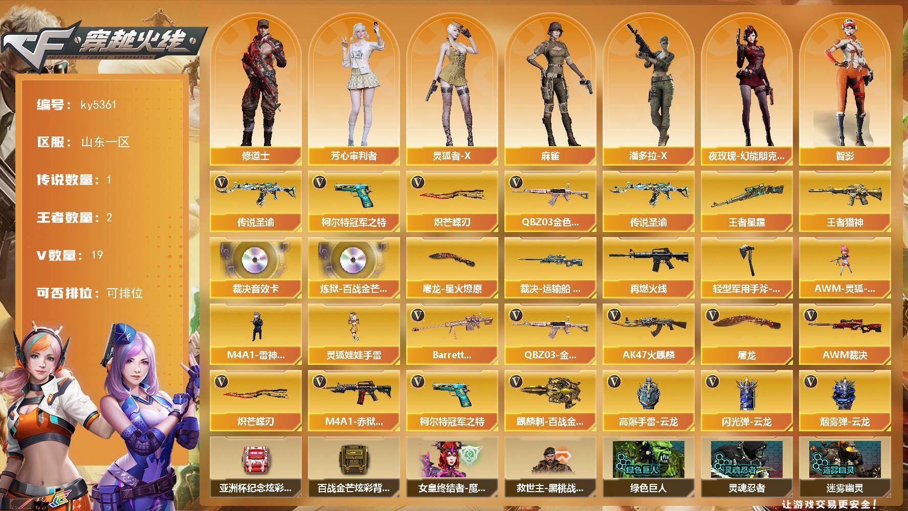 - [11519017]2传说角色 2王者武器 1炫金武器 51V武器 可二次 可修改实名 优质装备:M200-幻神,QBZ03-金色蔷薇,柯尔特-冠军之特,柯尔特-荣耀世冠白鲨2023,AK47-火麒麟,AK47-无影,AK47-黑武士,M4A1-雷神,M4A1-黑骑士,M4A1-黑龙,Barrett-毁灭,Barrett-极光,AWM-天龙,AWM-裁决,AA-12-雷霆,AN94-超新星,9A91-烈火,汤姆逊-烈龙,沙鹰-天神,龙啸,麒麟刺,M14EBR-玄武,龙啸-烈火龙威,金色蔷薇-古蛇迷踪,修罗-古蛇迷踪 排位资格:有 V武器:天神-CF网剧冠军,黑武士-CF网剧冠军,AK-47-猩红传说 王者武器:王者幻神-觉醒版,王者之魄-觉醒版,王者之啸-觉醒版,王者炎心 炫金武器:炫金黑骑士 热门武器:COP-白鲨