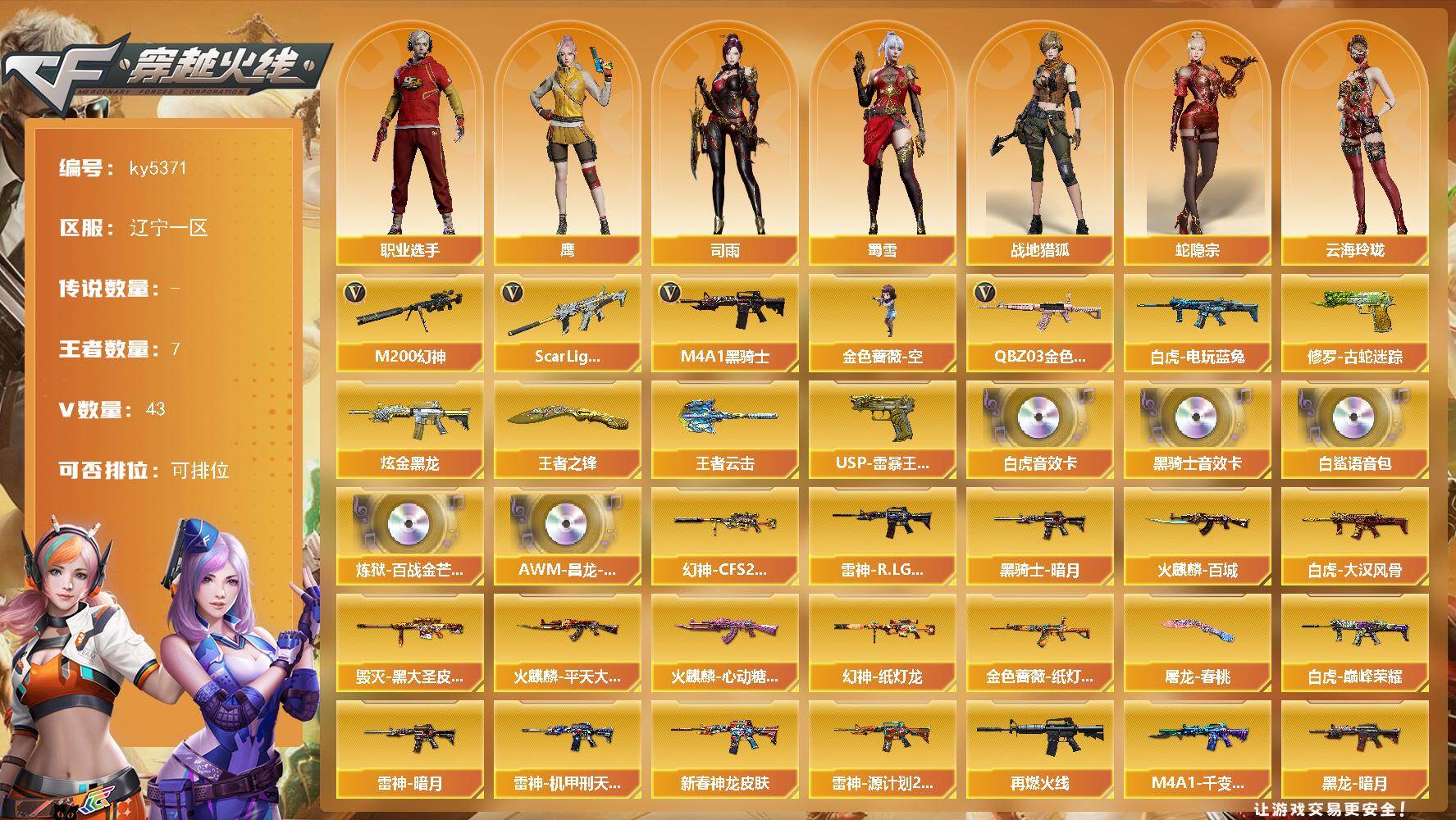 [17119435]辽宁一区-44V-7王者武器数-1炫金武器数 【热门武器】:QBZ03-金色蔷薇,Scar Light-白虎*2,M200-幻神,修罗-古蛇迷踪,白虎-电玩蓝兔,M4A1-黑骑士,金色蔷薇-空 【王者炫金武器】:USP-雷暴王者,王者之锋,王者云击,炫金黑龙 【音效卡】:M4A1-黑骑士音效卡,Scar Light-白虎音效卡,白鲨语音包,炼狱-百战金芒-庆典舞曲音效卡,AWM-昌龙-怀旧音效卡 【皮肤】:幻神-CFS2022,幻神-纸灯龙皮肤,白虎-大汉风骨,白虎-巅峰荣耀 皮肤,金色蔷薇-纸灯龙皮肤,雷神-暗月,雷神-R.LGD-CFPLS18冠军,雷神-机甲刑天皮肤,M4A1-雷神-新春神龙皮肤,雷神-源计划2.0专属 皮肤,M4A1-再燃火线,火麒麟-平天大圣*2,火麒麟-百城,火麒麟-心动糖果,毁灭-黑大圣皮肤*2,M4A1-千变-孔明皮肤,黑龙-暗月,黑骑士-暗月,黑骑士-破界 皮肤,无影-能量核心,战神-粉色甜心皮肤,战神-紫绶金章皮肤,AK47-B-常胜将军-孙权,屠龙-春桃 皮肤,轻型军用手斧-再燃火线 【角色】:鹰,司雨,战地猎狐,蛇隐宗,云海玲珑,暗夜-X,初恋灵狐,电竞少女,芳心审判者,风暴女,虎妞,嘉年华灵狐,娟娟,猎狐者-追月,0号玩家,灵狐-花神,灵狐者-X,灵狐者-七夕宝贝,龙儿-小淘气,麻雀,潘多拉-X,潘多拉-甜心教官,蛇姬,斯沃特-X,蜀雪,兔囡囡,维纳斯,雪莉杨-摸金校尉,游珑儿,职业选手 【人偶武器】:天龙-曼陀罗,火麒麟-灵狐,M4A1-雷神-精英刀锋,金色蔷薇-空,巴雷特-零-水下丽影,AWM-灵狐-15周年嘉年华,迷你裂空之翼,迷你牛魔王,迷你波特博士*4,夺魂*2,迷你火种,生化手雷-机甲核心*2,深渊终结者手雷,迷你超能女侍,迷你巨石泰坦-魔花研究所 【暴走生化】:黑龙吞噬者,超级对讲机 【挑战大师】:冰龙粉碎者-白马银枪,激光毁灭者III,机甲撕裂者III,试炼破坏者III,神圣爆裂者-末日III 【英雄级武器】:AK47-火麒麟*2,M4A1-雷神*2,M4A1-黑骑士,AK47-机械迷城,Scar Light-白虎*2,无影-神兵利器,黑武士-锦绣游龙,QBZ03-金色蔷薇,王者之心-觉醒版,AK-47-猩红传说*2,AK47-B-常胜将军,白虎-电玩蓝兔,M200-幻神,王者之力-觉醒版,王者星神-觉醒版