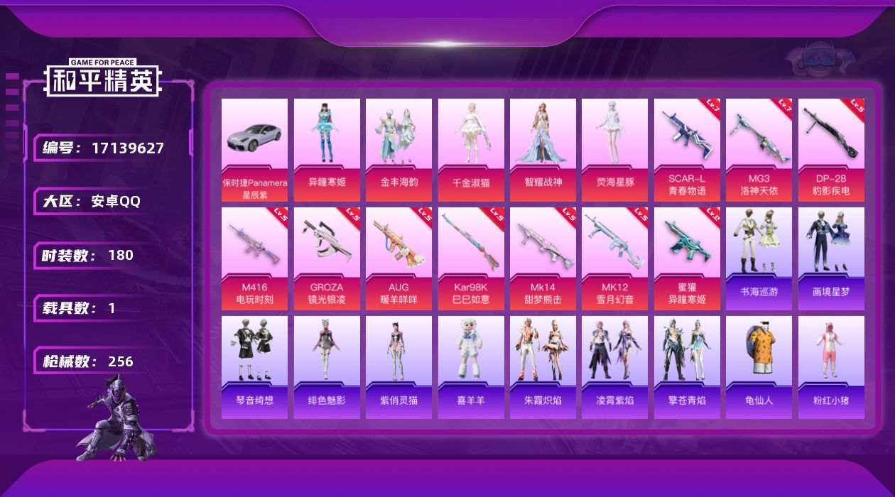 [17139627]安卓 手Q-5粉装-10特效枪-1载具-7粉色飞行器-77363热力值-15王牌印记-180套装-256枪皮