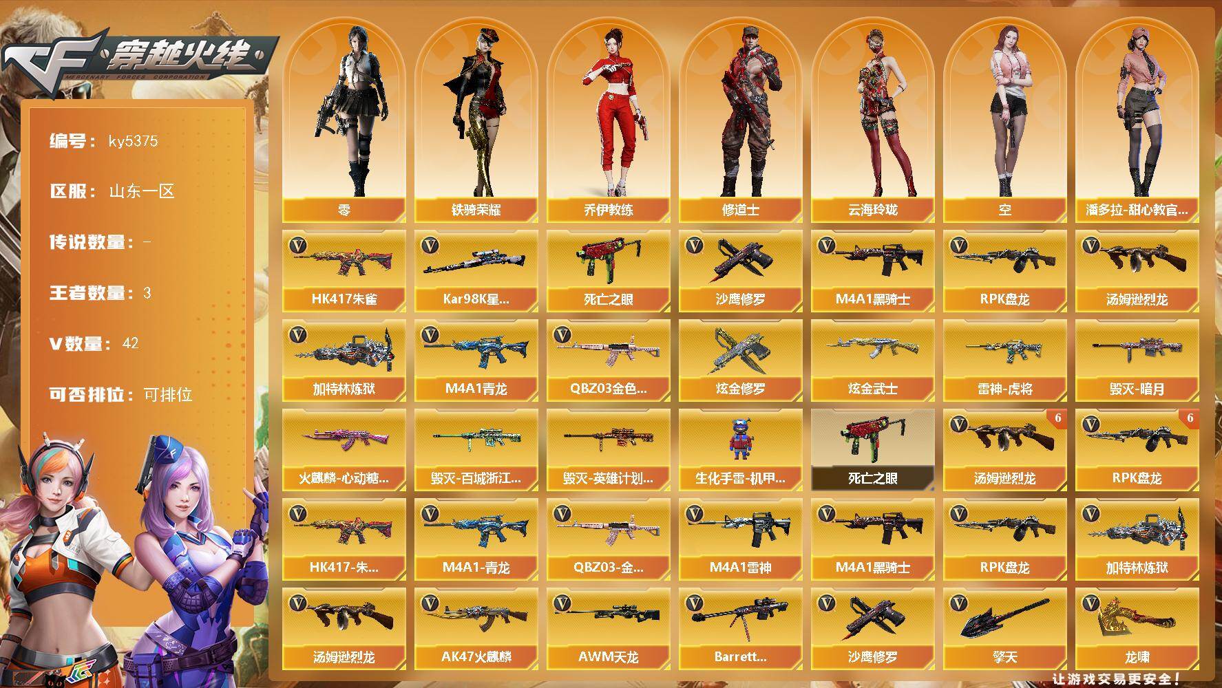 [16882756]山东一区-46V-3王者武器数-2炫金武器数 【热门武器】:QBZ03-金色蔷薇,HK417-朱雀,M4A1-青龙,死亡之眼*2,Kar98K-星神,M4A1-黑骑士*2,汤姆逊-烈龙*6,RPK-盘龙*7,加特林-炼狱*2,沙鹰-修罗*2 【王者炫金武器】:炫金武士,炫金修罗 【皮肤】:雷神-虎将,火麒麟-心动糖果,毁灭-暗月,毁灭-百城浙江 皮肤,毁灭-英雄计划 皮肤 【角色】:零,乔伊教练,修道士,云海玲珑,空,潘多拉-甜心教官,斯沃特-X,铁骑荣耀,雪莉杨-摸金校尉 【人偶武器】:生化手雷-机甲核心*3 【暴走生化】:死亡之眼*2 【英雄级武器】:M4A1-千变,AK47-火麒麟,M4A1-雷神,M4A1-黑骑士*2,AK47-黑鲨,M4A1-青龙,HK417-朱雀,QBZ03-金色蔷薇,王者之势-觉醒版,王者之戮-觉醒版,王者炎心-觉醒版,黑骑士-海王,AWM-天龙,Barrett-毁灭,Barrett-朱雀,Kar98K-星神,RPK-盘龙*7,加特林-炼狱*2,汤姆逊-烈龙*6,沙鹰-修罗*2,屠龙,龙啸*2,擎天,高爆手雷-竞技荣光,烟雾弹-竞技荣光 【道具】:CFS限定背包,云山科技背包,炫彩背包,女皇终结者-魔龙之吻,绿色巨人,灵魂忍者,迷雾幽灵,夺命之镰*2,防化服*3,金色流光-枪王排位,星辰流光-枪王排位,枪王排位28赛季金色流光,EP战队名片,EP战队喷图,防弹头盔*4,防弹衣*4,C4工具钳*4,手雷包*4 【特殊枪械】:2黑骑士,6烈龙,6盘龙,2炼狱