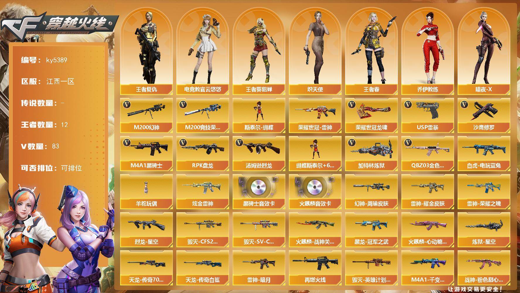 [16883645]江西一区-87V-12王者武器数-1炫金武器数 【热门武器】:QBZ03-金色蔷薇,M200-幻神,M200-竞技荣光,荣耀世冠-雷神,白虎-电玩蓝兔,M4A1-黑骑士*4,汤姆逊-烈龙*6,RPK-盘龙*4,加特林-炼狱*2,斯泰尔-蝴蝶,羊驼玩偶,USP-雷暴,沙鹰-修罗*6,荣耀世冠-龙啸 【王者炫金武器】:炫金雷神 【音效卡】:AK47-火麒麟音效卡,M4A1-黑骑士音效卡 【皮肤】:幻神-周瑜皮肤,烈龙-星空,雷神-暗月,雷神-荣耀之魄,雷神-耀金皮肤,M4A1-再燃火线,火麒麟-战神关羽,火麒麟-心动糖果,毁灭-CFS2020,毁灭-SV-CFPLS16冠军,毁灭-英雄计划 皮肤,M4A1-千变-孔明皮肤,黑龙-冠军之武,战神-粉色甜心皮肤,战神-紫绶金章皮肤*2,AK47-B-常胜将军-曹操*2,AK47-B-常胜将军-刘备*3,AWM-天龙-传奇70KG,AWM-天龙-传奇白鲨,炼狱-星空,轻型军用手斧-再燃火线 【角色】:电竞教官-云悠悠,王者-葵-貂蝉,王者复仇,王者春,乔伊教练,炽天使,暗夜-X,北极狐-X,娟娟,灵狐者-X,灵狐者-黄金海岸,龙儿,龙儿-小淘气,曼陀罗-X,潘多拉-X,潘多拉-甜心教官,潜龙队-X,斯沃特-X,铁骑-乘风破浪,新娜塔莎,樱-战斗天使,影武者-X 【人偶武器】:斯泰尔-蝴蝶,M37-葵,夺魂,深渊终结者手雷,闪光弹-貂蝉,高爆手雷-大乔,迷你艾比,迷你超能女侍 【暴走生化】:黑龙吞噬者,超级对讲机 【挑战大师】:激光毁灭者III 【英雄级武器】:AK47-火麒麟*3,M4A1-黑龙,M4A1-雷神*4,M4A1-黑骑士*4,AK47-无影,AK47-黑武士,M4A1-龙血*2,无影-神兵利器,M4A1-玫瑰精灵,QBZ03-金色蔷薇,M4A1-猎神,AK-47-猩红传说,AK47-B-战神,黑骑士-海王,AK47-B-常胜将军*2,白虎-电玩蓝兔,荣耀世冠-雷神,AWM-天龙,Barrett-毁灭*3,AWM-裁决,M200-幻神,Barrett-朱雀,M200-竞技荣光,RPK-盘龙*4,加特林-炼狱*2,汤姆逊-烈龙*6,沙鹰-修罗*6,USP-雷暴,柯尔特-竞技荣光,天神-动感闪耀,幻灵之锋,擎天-竞技荣光,荣耀世冠-龙啸,麒麟刺-百战金芒,王者之锋-觉醒版*2,雷霆王者之锋-觉醒版,高爆手雷-幻灵,高爆