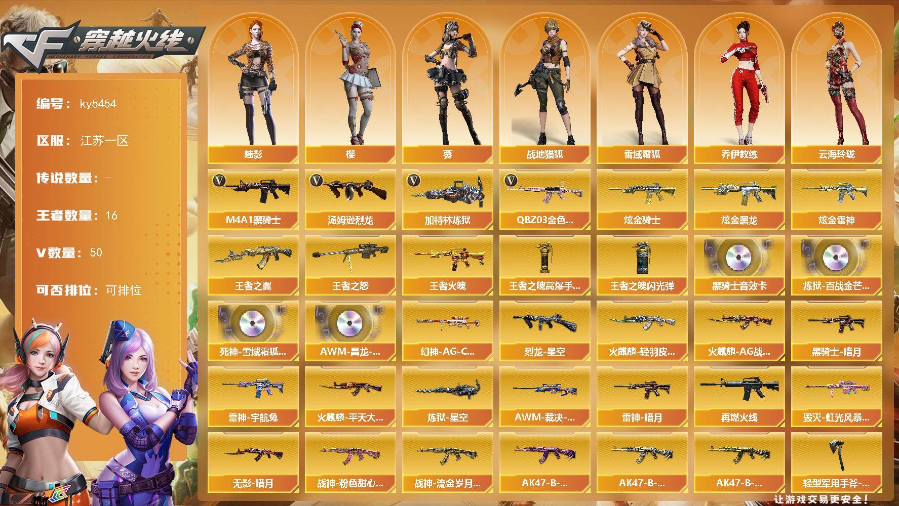 [16885389]江苏一区-56V-16王者武器数-5炫金武器数 【传说角色】:传说星骇 【热门武器】:QBZ03-金色蔷薇*2,M4A1-黑骑士,汤姆逊-烈龙*4,加特林-炼狱*2 【王者炫金武器】:王者之翼,王者火魄,王者之怒,炫金骑士*2,炫金黑龙*2,炫金雷神,王者之魄高爆手雷*2,王者之魄闪光弹*5 【音效卡】:M4A1-黑骑士音效卡,炼狱-百战金芒-庆典舞曲音效卡,死神-雪域霜狐-怀旧音效卡,AWM-昌龙-怀旧音效卡 【皮肤】:幻神-AG-CFPL S24冠军 皮肤,AWM-裁决-百城联赛天津皮肤,烈龙-星空,雷神-暗月,雷神-宇航兔皮肤,M4A1-再燃火线,火麒麟-AG战队皮肤,火麒麟-轻羽皮肤,火麒麟-平天大圣,毁灭-虹光风暴 皮肤,黑骑士-暗月,无影-暗月,战神-粉色甜心皮肤,战神-流金岁月皮肤*2,AK47-B-常胜将军-曹操,AK47-B-常胜将军-刘备,AK47-B-常胜将军-孙权*3,炼狱-星空,轻型军用手斧-再燃火线 【角色】:葵,樱,魅影,战地猎狐,雪域霜狐,奇洋探员,乔伊教练,云海玲珑,暗夜-X,芳心审判者,疾风,兰-海滩派对,兰妹妹,灵狐者-黄金海岸,潜龙队-X,铁骑-乘风破浪,兔囡囡,新娜塔莎,雪莉杨,智影 【人偶武器】:天龙-曼陀罗,迷你深渊冰龙*2,迷你裂空之翼,闪光弹-小乔,闪光弹-貂蝉,高爆手雷-大乔 【挑战大师】:冰龙粉碎者-白马银枪 【英雄级武器】:AK47-火麒麟*2,M4A1-雷神,M4A1-黑骑士,AK47-无影,AK12-天启,AK47-黑鲨*2,死神-雪域霜狐,M4A1-玫瑰精灵,QBZ03-金色蔷薇*2,王者之魄-觉醒版,AK-47-猩红传说*3,王者火魄-觉醒版,黑骑士-海王*2,AK47-B-常胜将军,AWM-天龙*2,Barrett-毁灭,AWM-裁决,Barrett-金色蔷薇*2,加特林-炼狱*2,炼狱-百战金芒,汤姆逊-烈龙*4,沙鹰-天神,屠龙,擎天,麒麟刺-百战金芒,王者之锋-觉醒版*2,王者之击-觉醒版*2,丛林匕首-玄豹,烟雾弹-玄豹,M4A1-赤狱骑士,M4A1-苍鸣雷神,AWM-昌龙 【道具】:BS战队炫彩背包,亚洲杯纪念炫彩背包,女皇终结者-背包,炫彩背包,百战金芒炫彩背包,背包-洛丽塔,超级背包,雪域霜狐炫彩背包,女皇终结者-魔龙之吻,救世主-黑桃战神,黄金生化钩,绿色巨人,灵魂忍者,迷雾幽灵,夺
