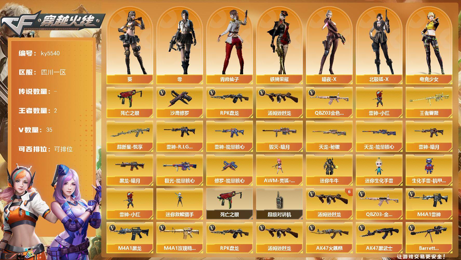 [16909533]四川一区-35V-2王者武器数-0炫金武器数 【热门武器】:QBZ03-金色蔷薇,死亡之眼,汤姆逊-烈龙*6,RPK-盘龙,雷神-小红,沙鹰-修罗*3 【王者炫金武器】:超新星-悦享,王者蔷薇 【皮肤】:雷神-暗月,雷神-能量核心*2,雷神-R.LGD-CFPLS18冠军,毁灭-暗月*2,黑龙-暗月,天龙-秘银,天龙-能量核心,极光-能量核心,修罗-能量核心*2 【角色】:零,葵,暗夜-X,北极狐-X,电竞少女,芳心审判者,风暴女,嘉年华灵狐,0号玩家,灵狐者-黄金海岸,青霞仙子,铁骑荣耀,维纳斯,新娜塔莎,雪莉杨,雪莉杨-摸金校尉,夜玫瑰-宠粉,影武者-X 【人偶武器】:雷神-小红,迷你救赎猎手,AWM-灵狐-15周年嘉年华,迷你牛牛,迷你生化手雷,生化手雷-机甲核心*3 【暴走生化】:死亡之眼,超级对讲机 【英雄级武器】:AK47-火麒麟*2,M4A1-黑龙,M4A1-雷神,AK47-黑武士,无影-神兵利器,M4A1-玫瑰精灵,QBZ03-金色蔷薇,Barrett-毁灭,Barrett-极光,RPK-盘龙,汤姆逊-烈龙*6,沙鹰-修罗*3,沙鹰-天神,屠龙*2,龙啸,马来剑-夜魔,擎天,麒麟刺,高爆手雷-夜魔,闪光弹-夜魔,烟雾弹-夜魔 【道具】:CFS限定背包,全能枪王背包,超级背包,绿色巨人,灵魂忍者*2,变异宝贝,妖姬,迷雾幽灵*2,夺命之镰,防化服*2,金色流光-枪王排位*2,星辰流光-枪王排位,枪王排位28赛季金色流光,枪王排位29赛季金色流光,EP战队名片,EP战队喷图,EP战队击杀图标,防弹头盔*3,防弹衣*3,C4工具钳*3,手雷包*2 【特殊枪械】:6烈龙,1盘龙