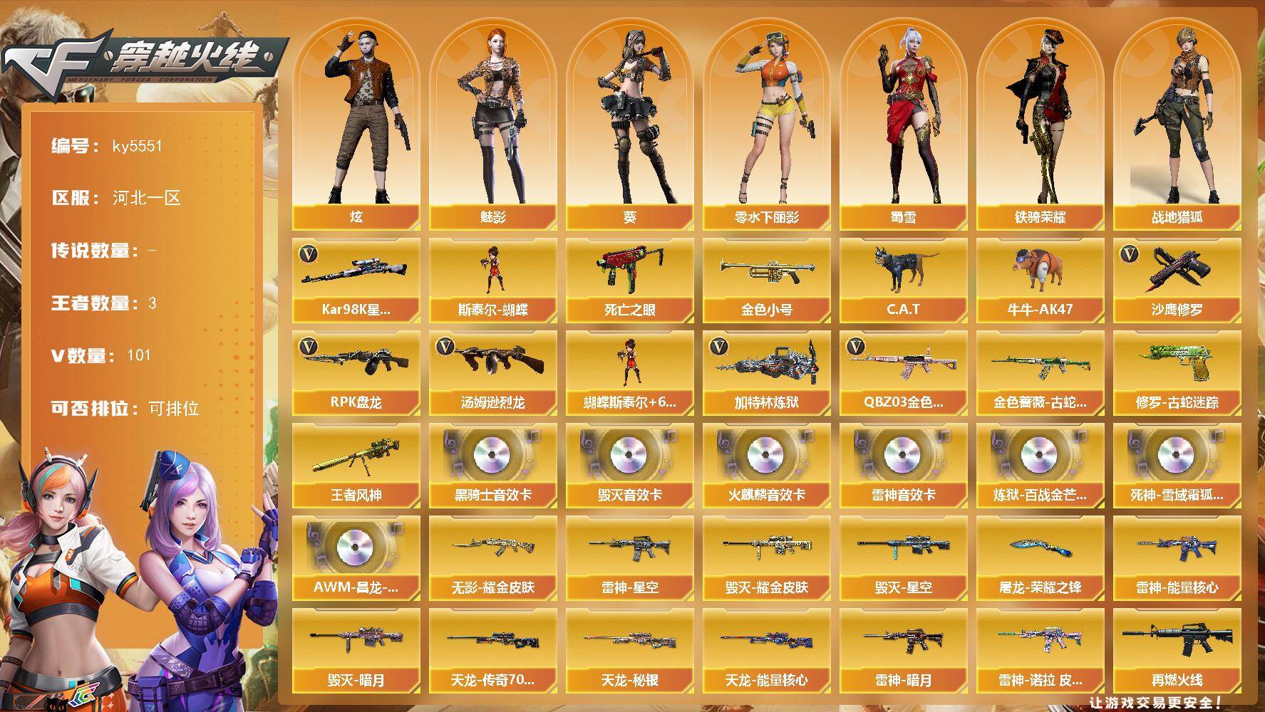 - [16573372]湖北一区-64V-9王者-2炫金 【热门武器】:M200-幻神,死亡之眼,荣耀世冠-火麒麟,荣耀世冠-雷神,荣耀世冠-柯尔特,M4A1-黑骑士,汤姆逊-烈龙*2,加特林-炼狱,斯泰尔-蝴蝶,沙鹰-修罗*6,荣耀世冠-龙啸 【王者炫金武器】:炫金超新星*2,王者之幻 【音效卡】:M200-幻神音效卡,M4A1-黑骑士音效卡,Barrett-毁灭音效卡 【稀有皮肤】:M200-幻神-黄忠皮肤,幻神-冠军之幻,雷神-荣耀之魄,雷神-星空,雷神-虎将,雷神-R.LGD-CFPLS18冠军,火麒麟-轻羽皮肤,火麒麟-巅峰荣耀,毁灭-星空,毁灭-冠军之怒 【角色】:王者-葵-貂蝉,王者玲珑-小乔,狐影,魅影 【人偶武器】:斯泰尔-蝴蝶,生化手雷-机甲核心,闪光弹-貂蝉,高爆手雷-大乔 【暴走生化】:斯泰尔-蝴蝶,死亡之眼 【挑战大师】:神圣爆裂者III,激光毁灭者III 【英雄级武器】:斩神刀-雷暴,M4A1-武圣,荣耀世冠-火麒麟,荣耀世冠-雷神,荣耀世冠-柯尔特,荣耀世冠-龙啸,M4A1-雷神*2,M4A1-黑骑士,M4A1-死神,加特林-炼狱,汤姆逊-烈龙*2,AK47-火麒麟,AK47-黑武士,AN94-超新星,Barrett-毁灭*5,Barrett-极光,AWM-裁决,M4A1-龙血*3,M200-幻神,AK47-黑鲨*2,AK-47-猩红传说,AK47-B-常胜将军,沙鹰-修罗*6,麒麟刺*2,擎天*3,龙啸*3,屠龙*2 【特殊枪械】:蝴蝶斯泰尔+2烈龙,1黑骑士,2烈龙,1炼狱,1蝴蝶斯泰尔